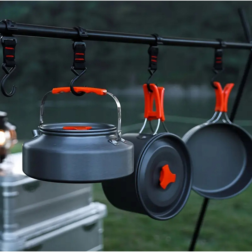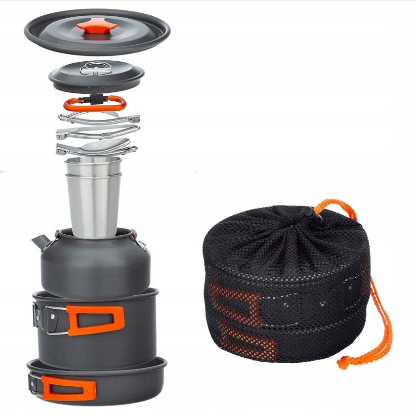 Многофункциональный набор: этот набор походной посуды и столовых приборов включает в себя 11 различных инструментов для приготовления пищи и столовой, в том числе алюминиевые походные кастрюли, сковороды, чайники и многое другое, чтобы удовлетворить ваши различные кулинарные потребности во время кемпинга, пикника и похода.