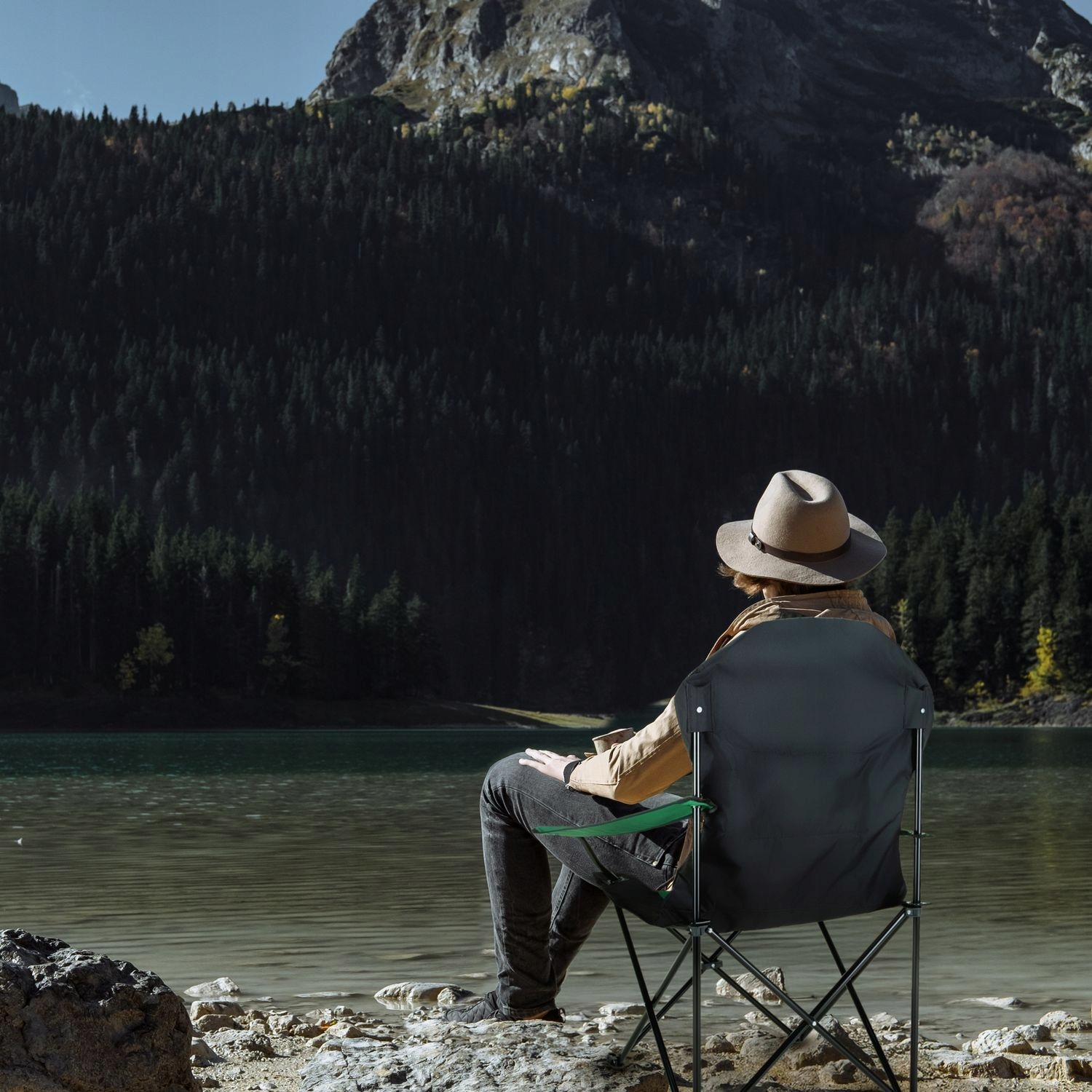 Складное кресло -стул является идеальным решением для кемпинга, рыбалки или отдыха. Сплошная, стальная рама гарантирует стабильность, а прочный материал сиденья устойчив к повреждению и грязи. сетчатые вставки Улучшение вентиляции и удобные подлокотники с пространством для напитка Увеличьте комфорт использования. складной дизайн и крышка с регулируемым ремешком облегчает транспортировку и хранение стула.