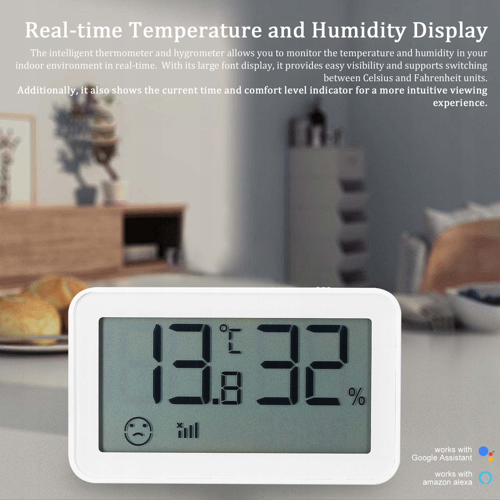Отображение температуры и влажности в реальном времени: интеллектуальный термометр и гигрометр позволяют отслеживать температуру и влажность в помещении в режиме реального времени. Благодаря крупному шрифту он обеспечивает удобную видимость и поддерживает переключение между единицами измерения Цельсия и Фаренгейта. Кроме того, он также показывает текущее время и индикатор уровня комфорта для более интуитивного просмотра.