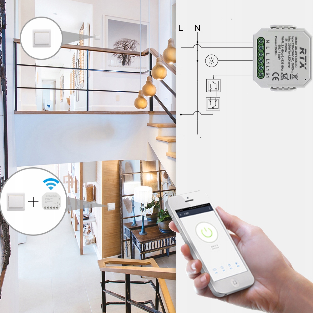 Модуль реле устанавливается в коробку под традиционным выключателем света. После подключения в соответствии со схемой вы сможете управлять включением света дистанционно из приложения, традиционно с помощью выключателя или в автоматическом режиме по заранее запрограммированным сценариям.
