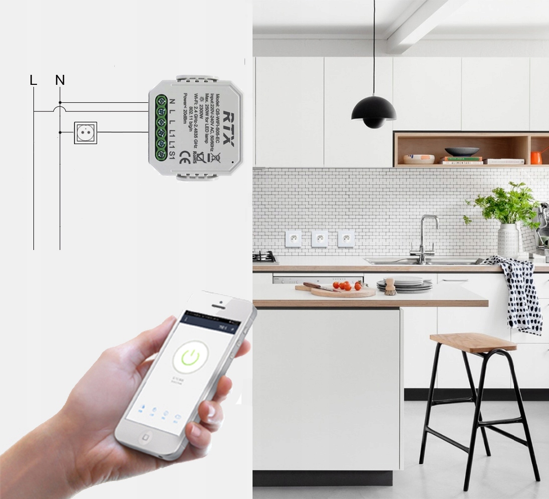 Релейный модуль устанавливается в коробку под традиционную розетку. После установки вы сможете управлять любым устройством, подключенным к розетке.