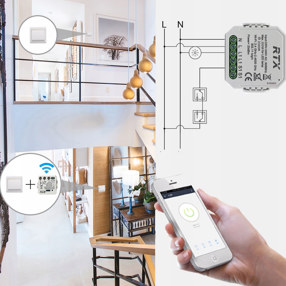 Модуль реле устанавливается в коробку под традиционным выключателем света. После подключения в соответствии со схемой вы сможете управлять включением света удаленно из приложения, традиционно с помощью выключателя или в автоматическом режиме по заранее запрограммированным сценариям.