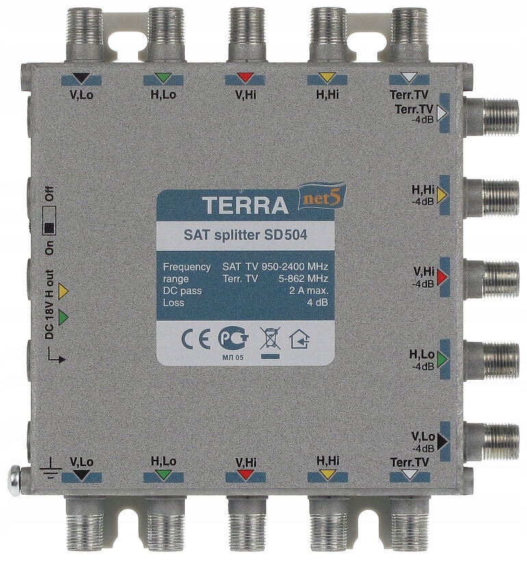 Разветвитель SD-504 используется в мультисвитчовых установках для отделения сигнала от мультисвитч-шины. Кроме того, разветвитель также выводит сигнал наземного телевидения. Разветвитель имеет переключатель постоянного тока, который, когда он установлен в положение «ВКЛ», передает напряжение постоянного тока через контакты «H» на обе ветви. В положении «ВЫКЛ» он передает напряжение только на одну ветвь.