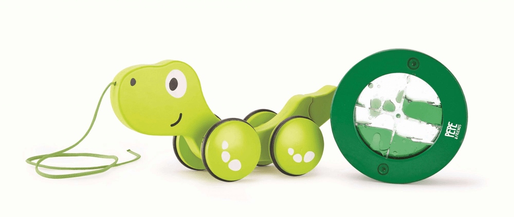 Тито — совершенно новая игрушка, которую можно тянуть. У маленькой зеленой черепахи на спине есть круглый контейнер, который вращается, когда ребенок ее тянет. Тем временем внутри течет интригующая зеленая жидкость. Контейнер можно снять со спины черепахи и использовать как отдельную игрушку.