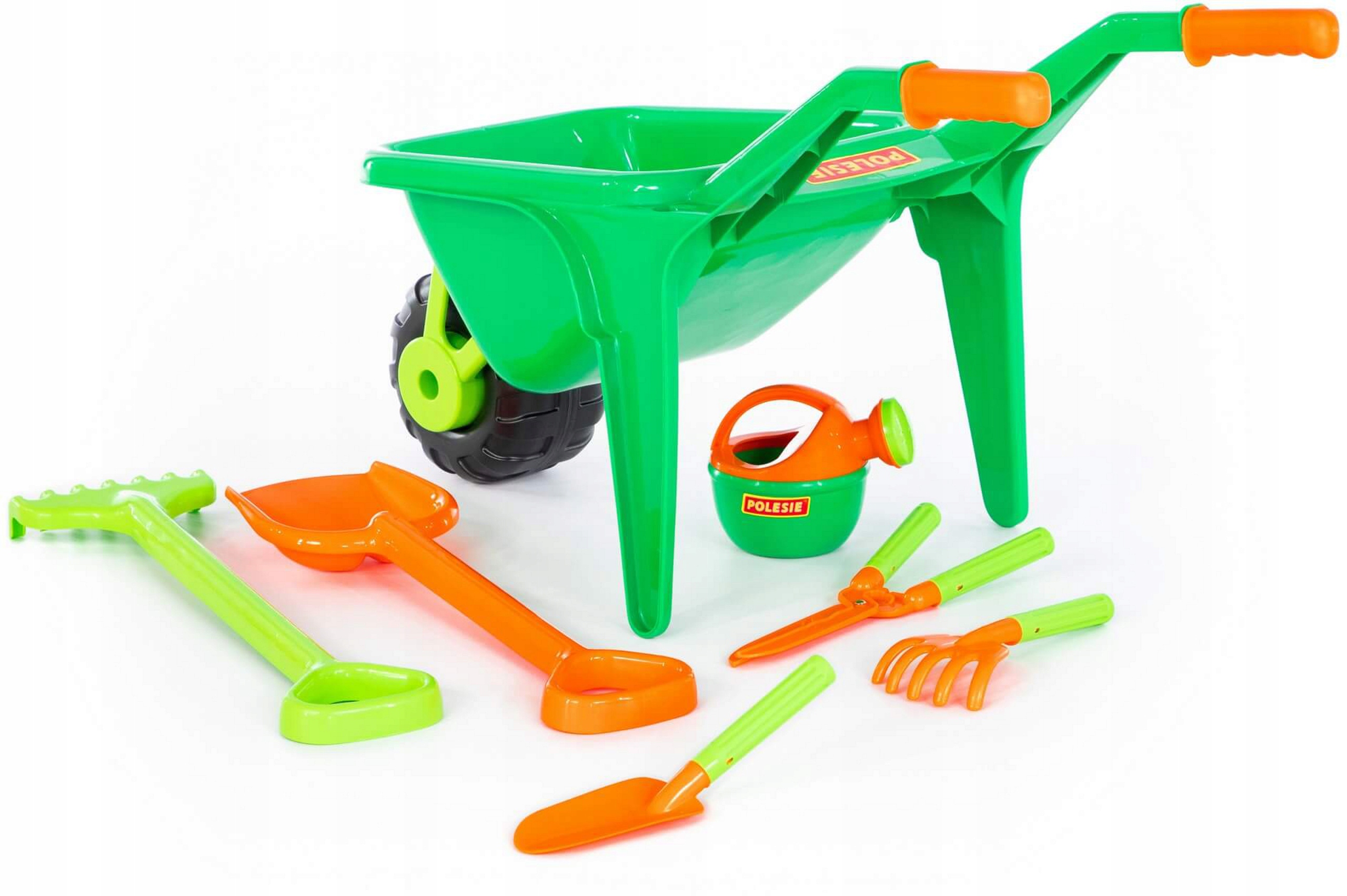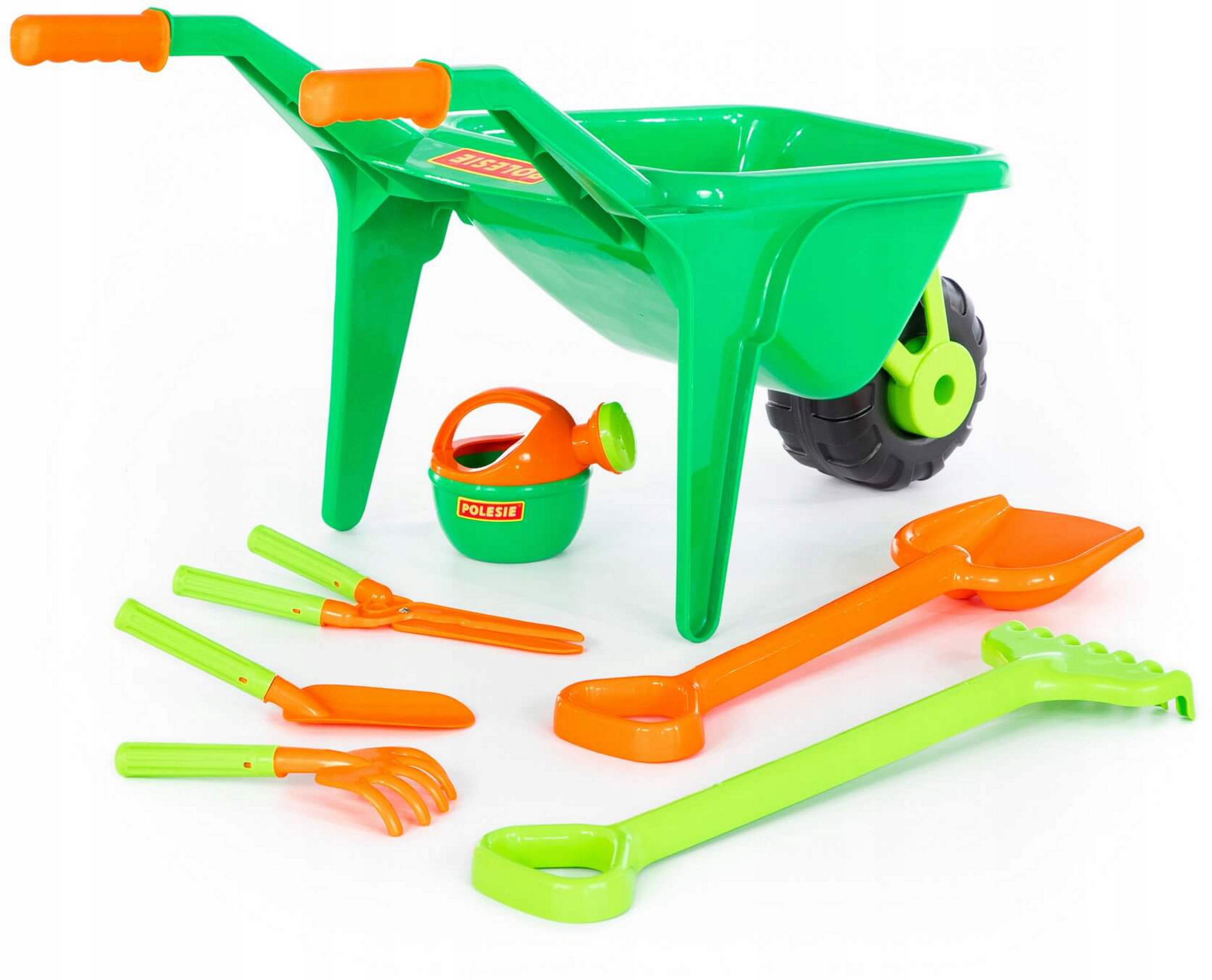 Незаменимый очень большой набор для игры в песке, в саду на пляже или на детской площадке, состоящей из 7 аксессуаров для песка, таких как: тачки на широком круге, небольшие гранжины, маленький совок, большой граней лопаток и полив.