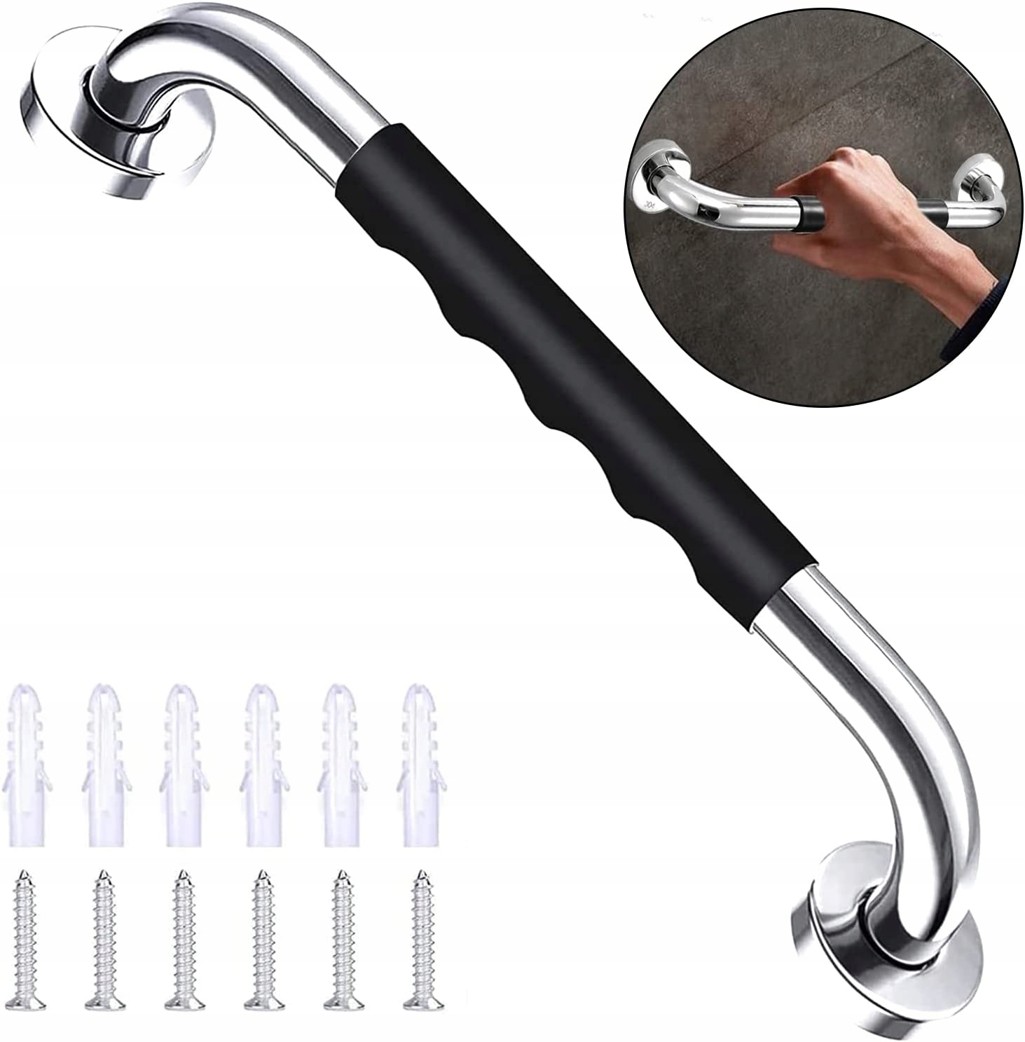 ❤ анти -стрижка -Держатель стены для ванной комнаты и душа с незлоколевой черной резиновой ручкой, которая идеально подходит для пяти пальцев, коэффициент против SLIP улучшается и приятен на ощущение. Если ваши руки покрыты мылом и должны стабилизироваться, поверхность не -сластической силиконовой ручки может повысить безопасность. Независимо от того, во время купания или в туалете он имеет хороший баланс для пожилых людей, детей и беременных и предотвращает скольжение. На каждой стороне держателя ванны есть три отверстия, которые можно установить, нажав. Душевые ручки имеют съемную крышку, которая может полностью покрыть все отверстия для винтов, что не влияет на внешний вид ванной комнаты и сохраняет ее в чистоте.