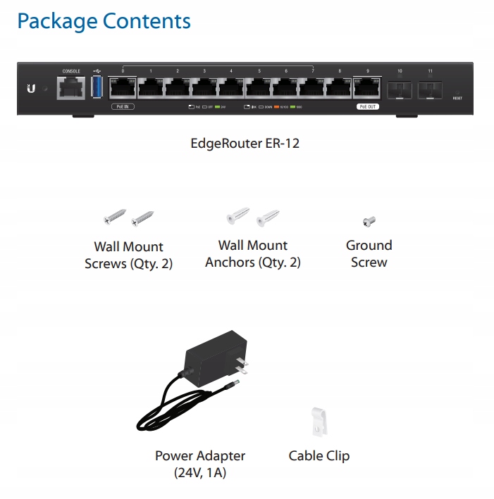 EdgeRouter 12 (ER-12) — маршрутизатор нового поколения из серии Ubiquiti EdgeMax™. Устройство оснащено десятью портами Gigabit Ethernet и двумя портами SFP (Gigabit). Благодаря четырехъядерному процессору MIPS64 с тактовой частотой 1 ГГц маршрутизатор достигает беспрецедентной для устройств этого класса производительности.
