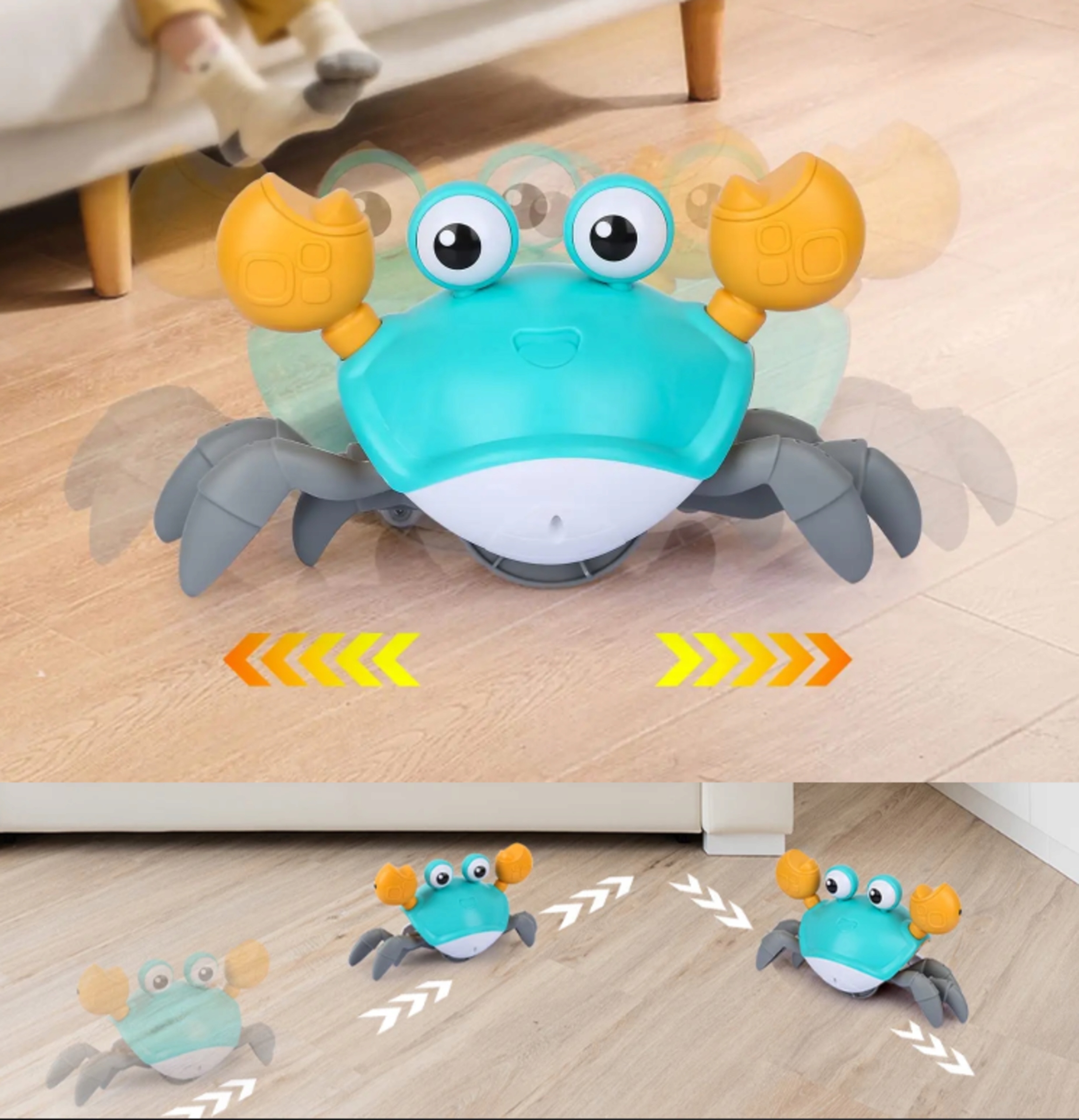 Детям понравится общаться с крабом, поскольку краб движется под свет и музыку. Музыкальная игрушка-краб может помочь развитию вашего малыша, стимулируя движения и координацию тела, ползание, зрительно-моторную координацию, общение между родителями и детьми.