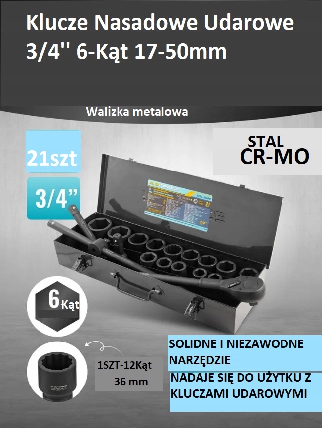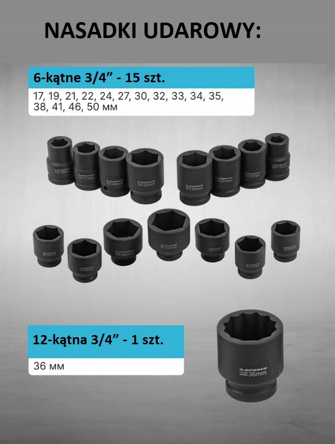 - Головки 6-гранные 3/4" - 15 шт. 17, 19, 21, 22, 24, 27, 30, 32 , 34, 35,36, (36 мм - угол 12), 38 мм, 41 мм, 46 мм, 50 мм;