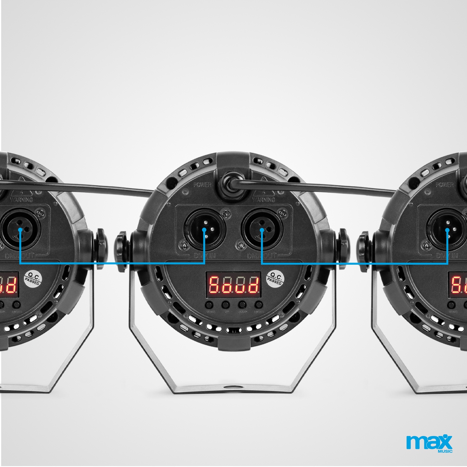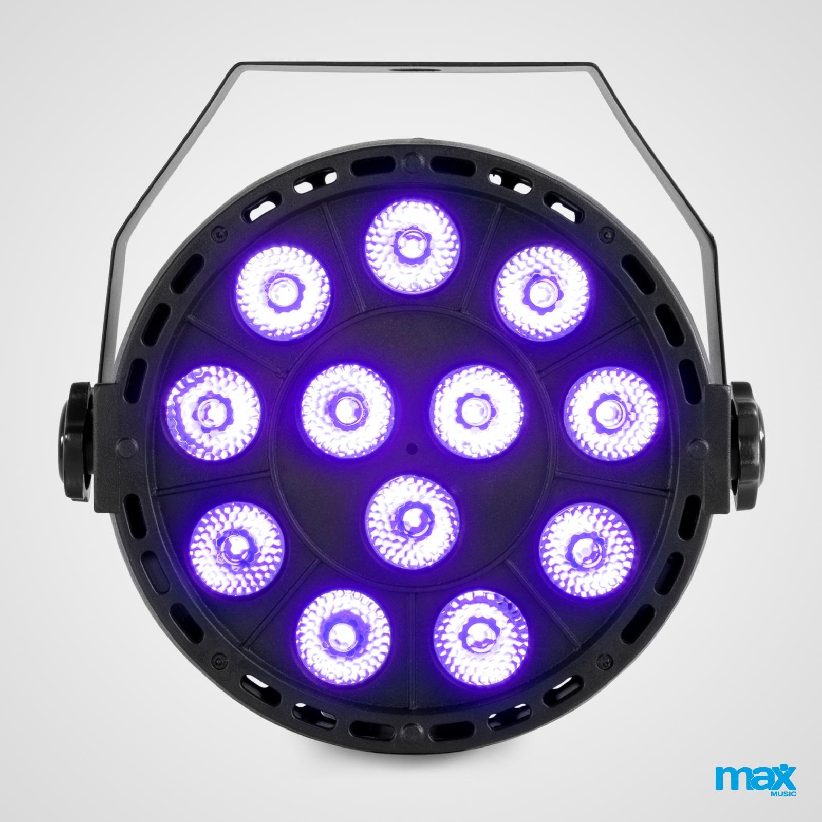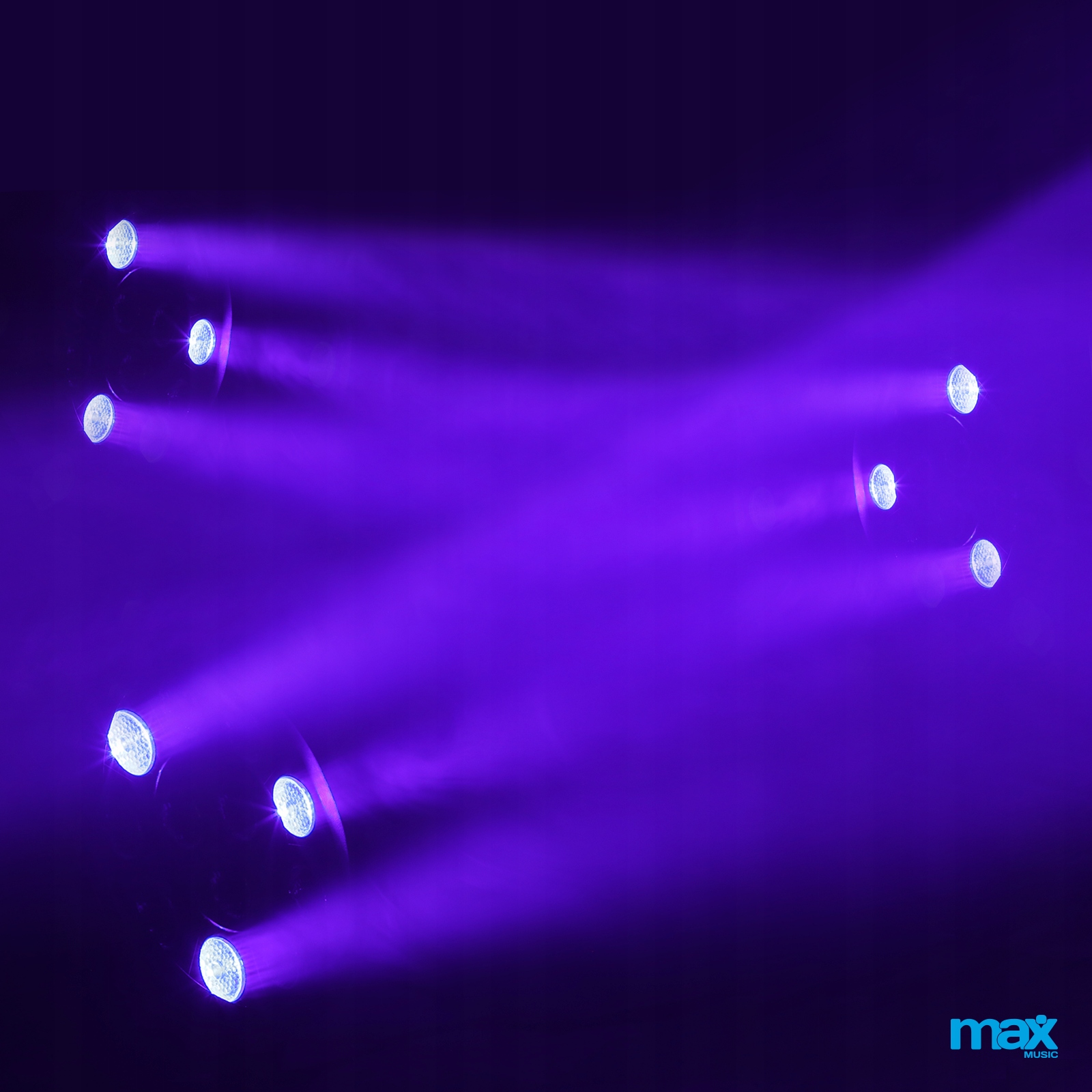 С 12 светодиодами с емкостью 1 Вт на диод Max Blacklight Partypar не имеет себе равных с точки зрения цены. Кроме того, он контролируется с помощью DMX, имеет внутренний микрофон для управления звуком, может работать над встроенной программой, и даже можно объединить множество единиц вместе, чтобы установить мастер/ раб. 12 светодиодов разделены на 4 секции, благодаря тому, что вы можете получить хорошее влияние на саму лампу.