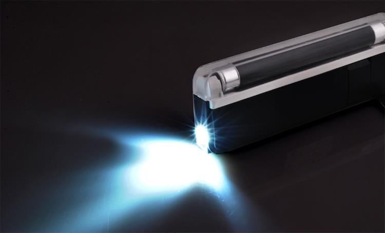 Тестер дополнительно оснащен практичным светодиодным фонариком, позволяющим проверять водяной знак и защитную нить.