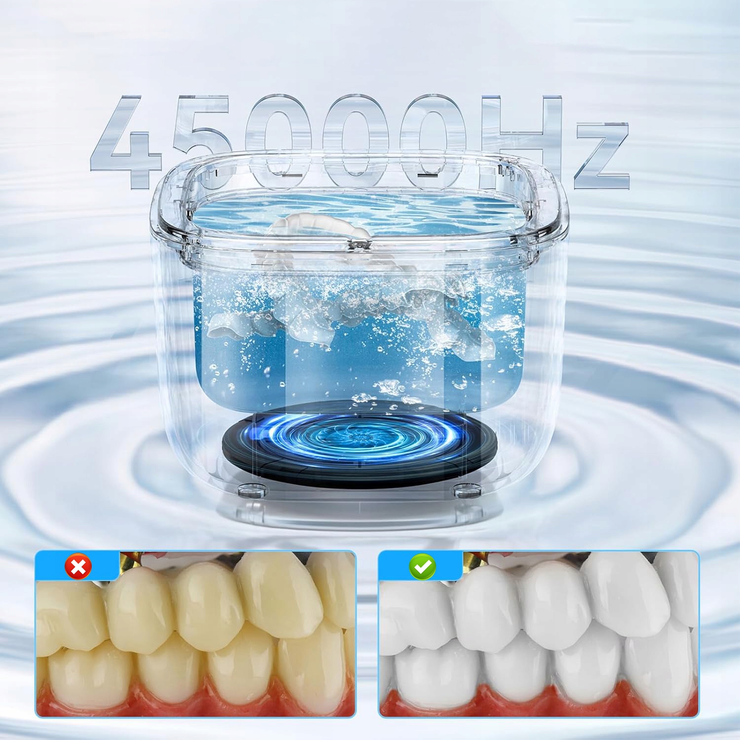 Используя ультразвуковые волны 42–45 кГц, он может проникать в щели и отверстия в зубах и эффективно удалять частицы с зубов, фиксаторов, брекетов, позиционеров зубов, капп для отбеливания, капп, насадок для зубных щеток и даже ювелирных изделий, а также ультрафиолетового света. глубоко очищает.