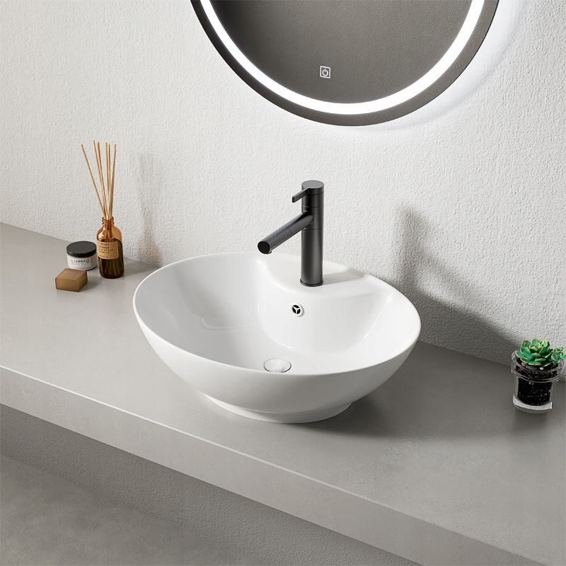 ОВАЛЬНАЯ КЕРАМИЧЕСКАЯ НАСТОЛЬНАЯ РАКОВИНА, БЕЛАЯ ГЛЯНЦЕВАЯ С ОТВЕРСТИЕМ ДЛЯ ПЕРЕЛИВА