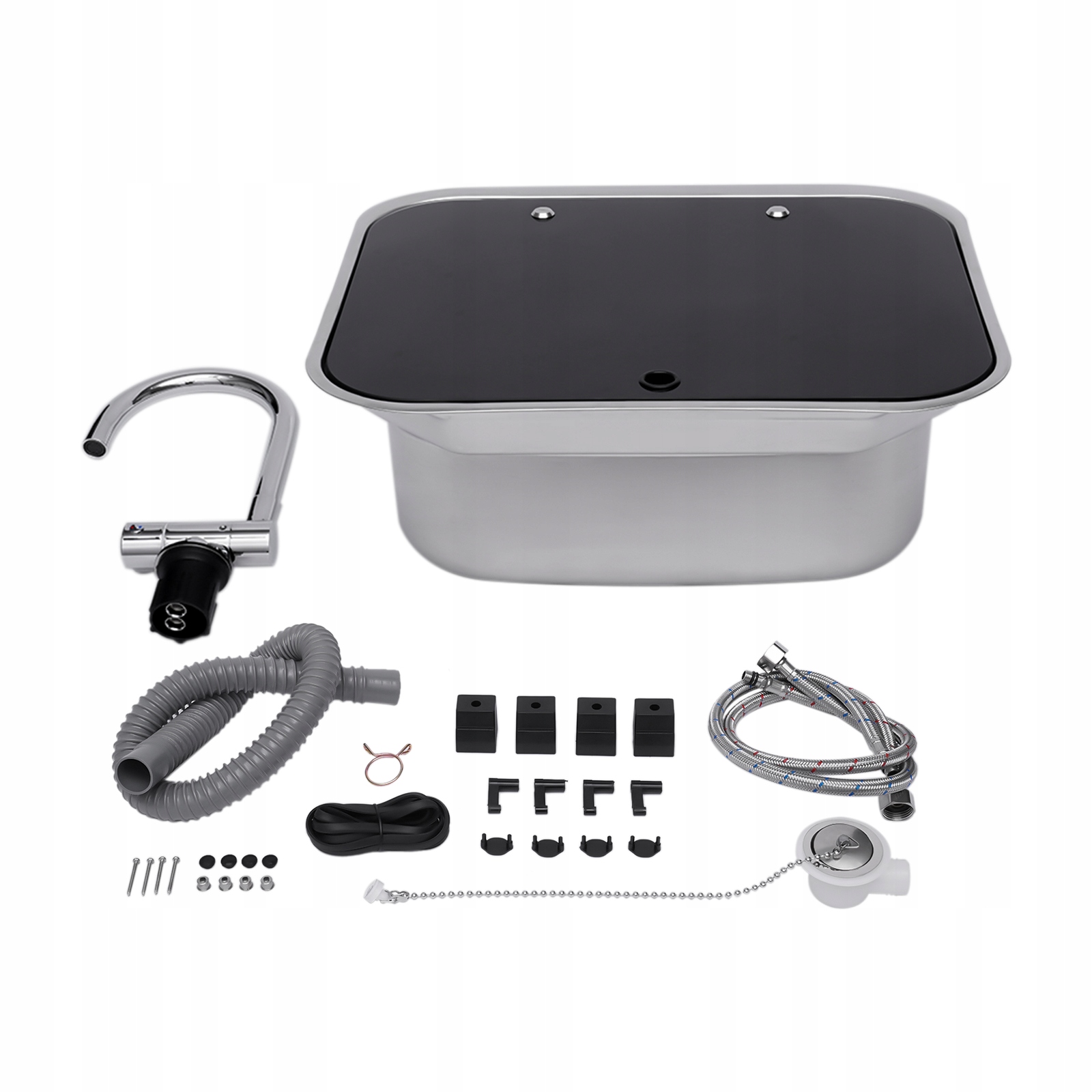 - Стильный внешний вид:Серебряная раковина очень блестящая и изысканная. Черная крышка выглядит стильно и универсально. А квадратная конструкция выглядит аккуратно и просто. Поэтому эта усовершенствованная раковина очень подходит для вашего кемпера.