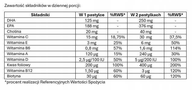 Состав: Рыбий жир, содержащий эйкозапентаеновую кислоту (EPA) и докозагексаеновую кислоту (DHA); подсластитель: ксилит; вода; подсластитель: сорбиты; желатин; битартрат холина; регулятор кислотности: цитраты натрия; натуральные ароматизаторы; L-аскорбиновая кислота; D-альфа-токоферол; подсластитель: стевиолгликозиды из стевии; краситель: экстракт перца, капсантин, капсорубин; пиридоксина гидрохлорид; птероилмоноглутаминовая кислота; ретинилпальмитат; цианокобаламин; холекальциферол; D-биотин.