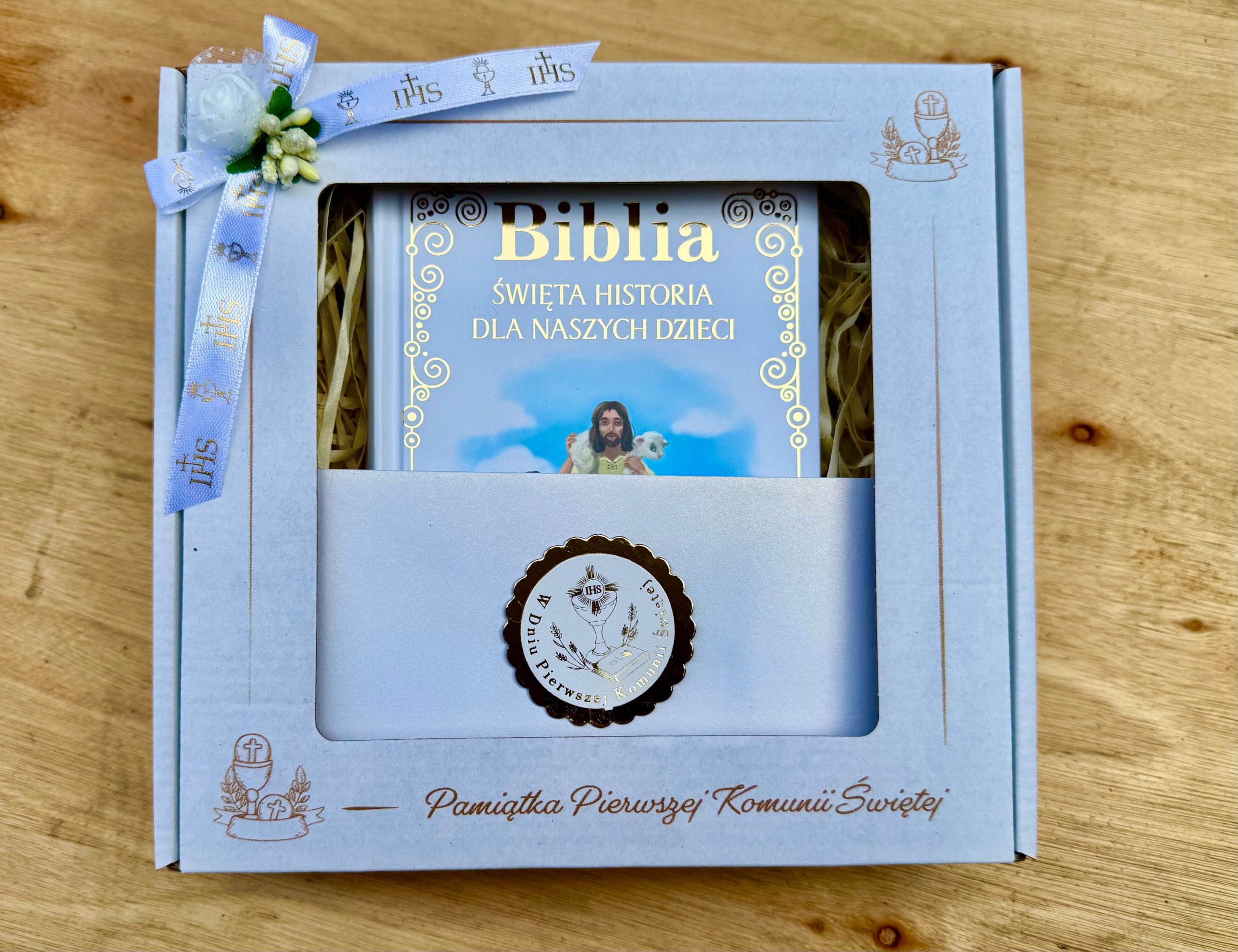 Уникальный и красивый набор: Библия с персонализацией декоративно упакована в элегантную картонную коробку, в наборе конверта за деньги - отличный подарок для первого святого причастия - практичное и оригинальное. h1>