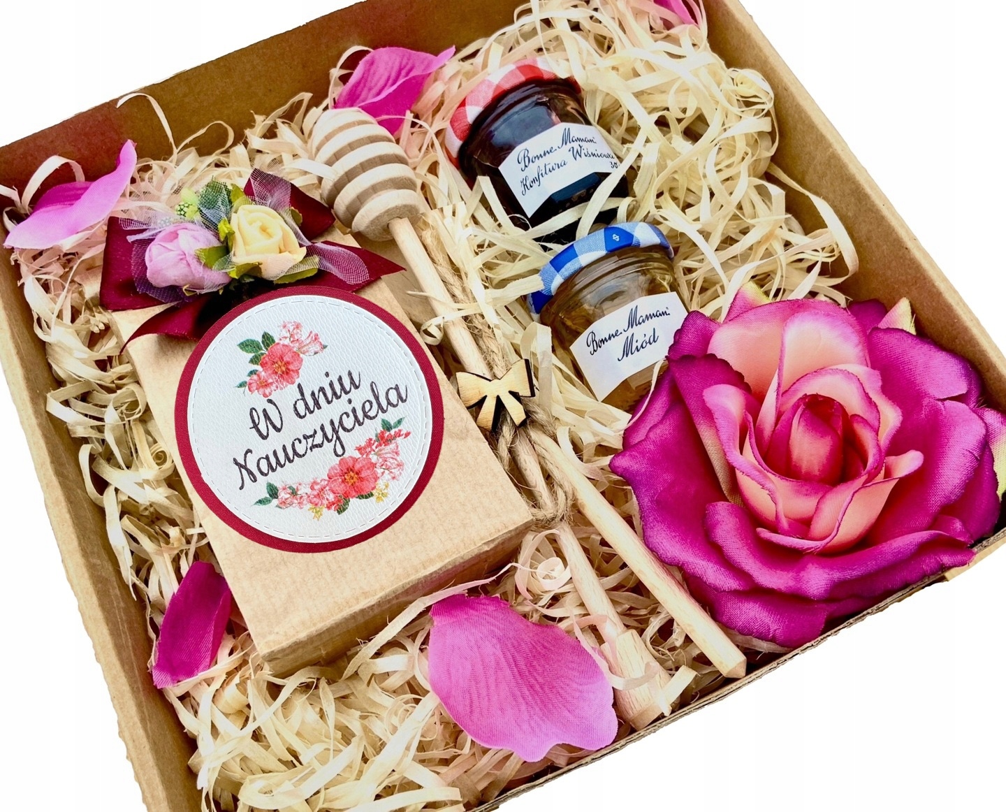 - деревянный набор - ложка для варенья и горшочек для меда, лепестки розы цвета фуксии,