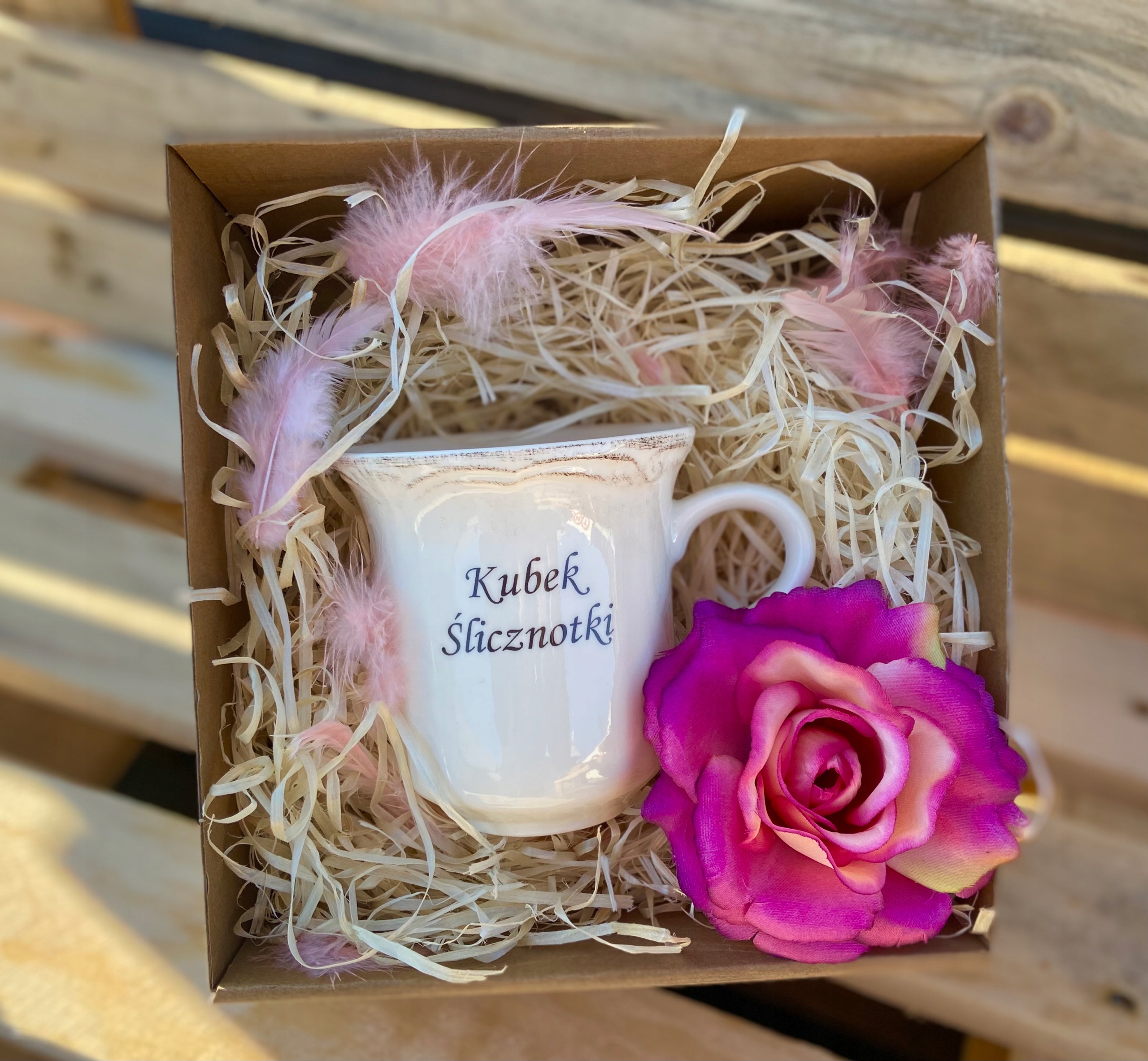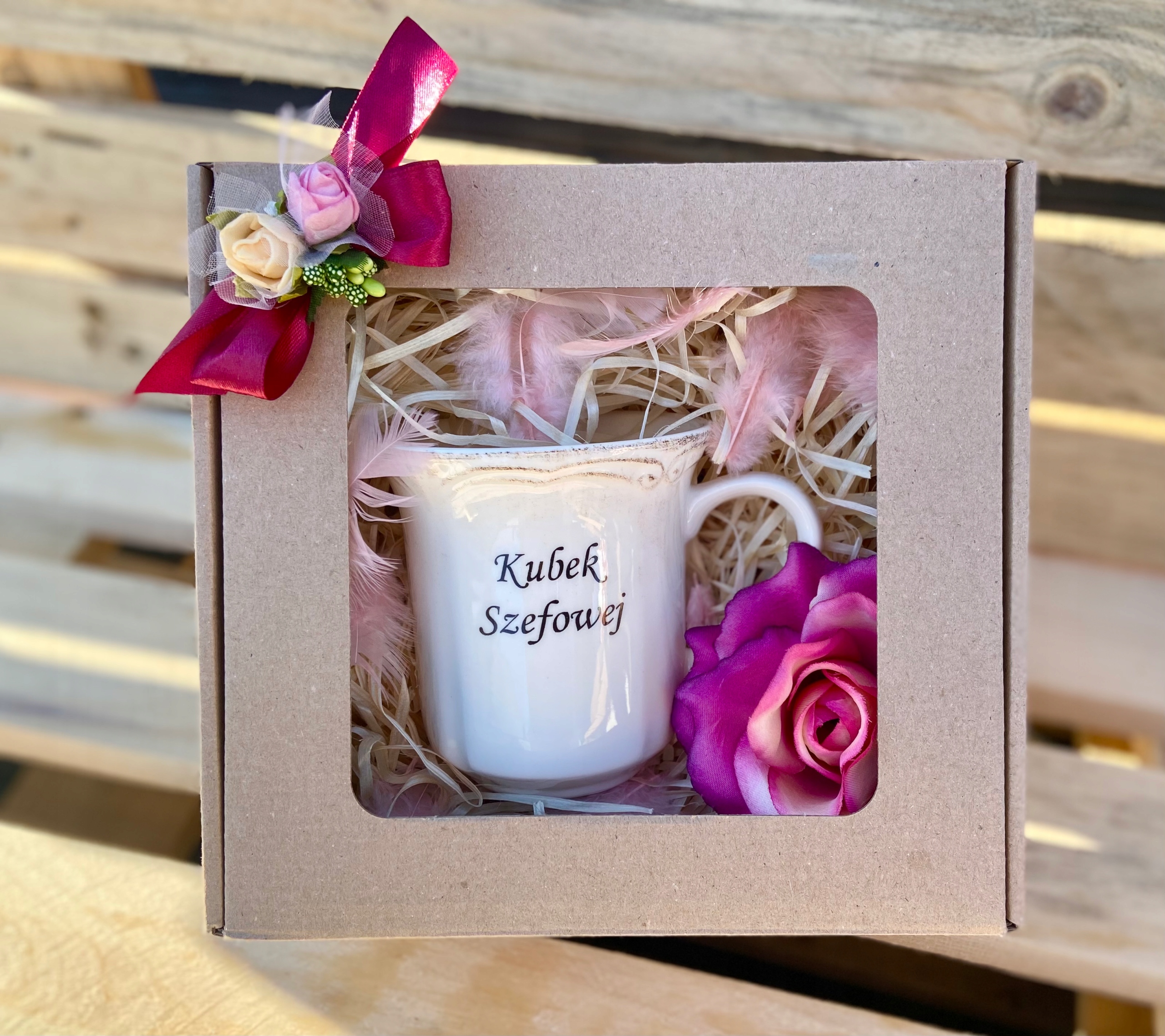 Каждая кружка элегантно упакована в целлофан и рафию. Вы получаете готовый подарок вместе с картой желаний.