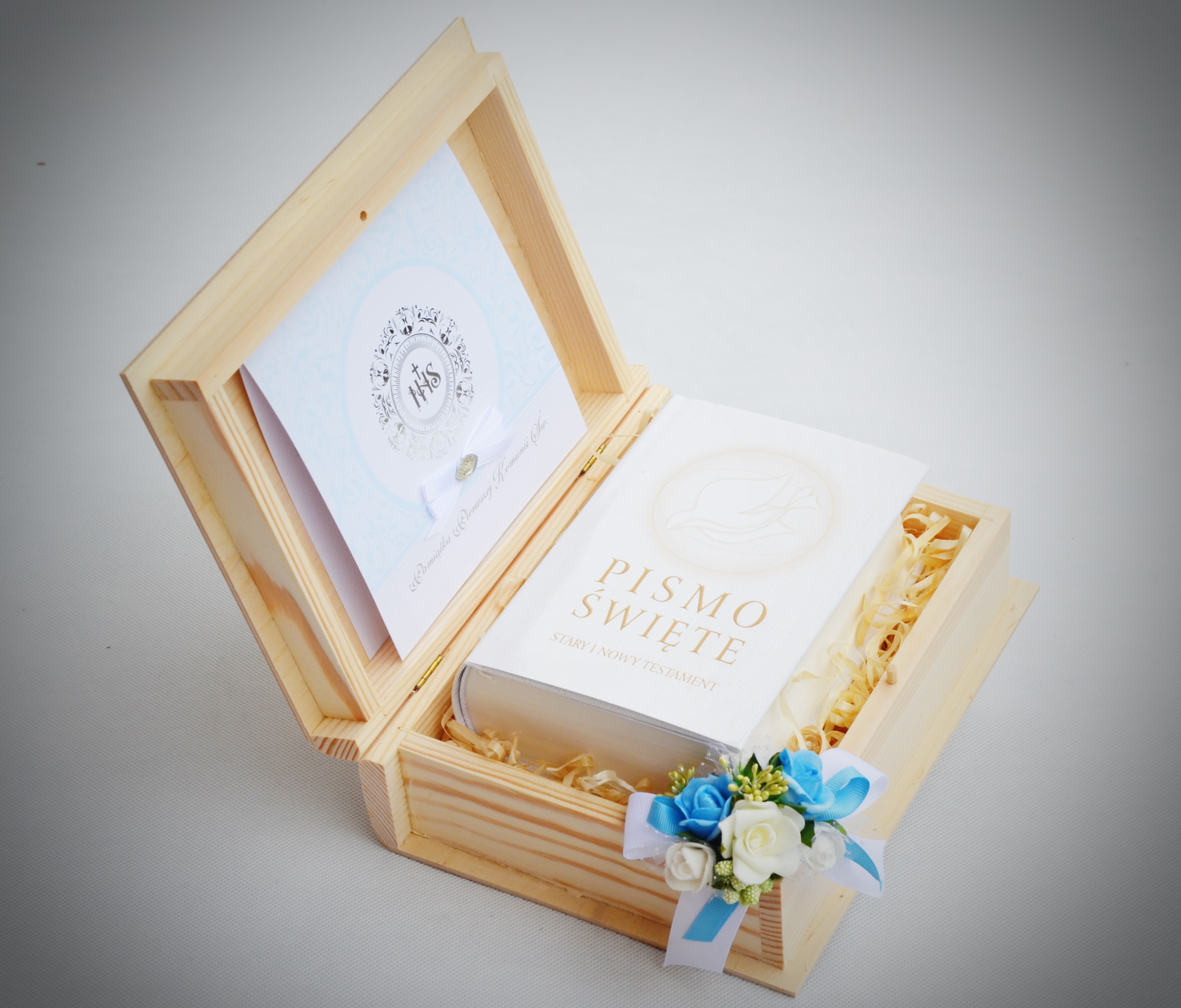Оформление в нежных синих тонах с белой и зеленой фурнитурой. В набор входит синий Сувенир Первого Причастия, который дополняет красивый внешний вид шкатулки, которую можно использовать как место для хранения Библии, священной книги или четок.