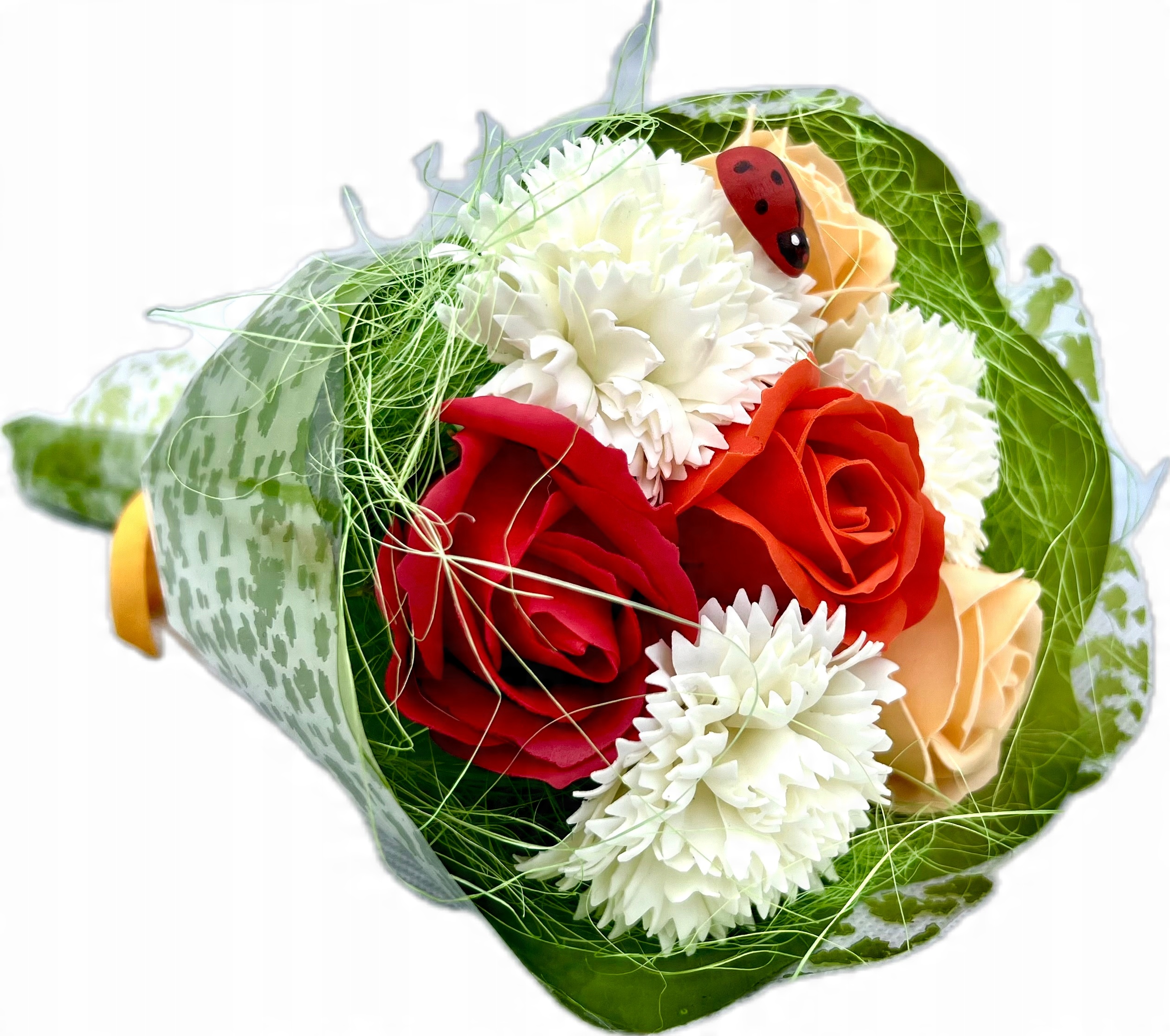 Букет составлен из 7 красивых, ароматных мыльных роз и гвоздик.