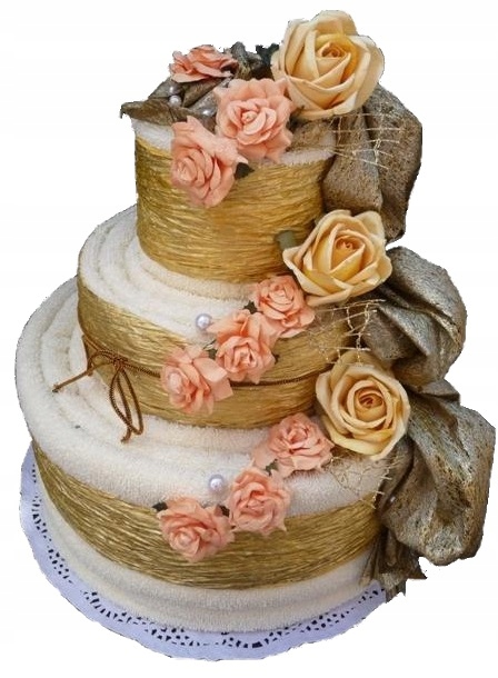 Красивый и оригинальный подарок на свадьбу и юбилей – практичный и элегантный комплект из 3-х полотенец разного размера в форме торта с богатым цветочным декором.