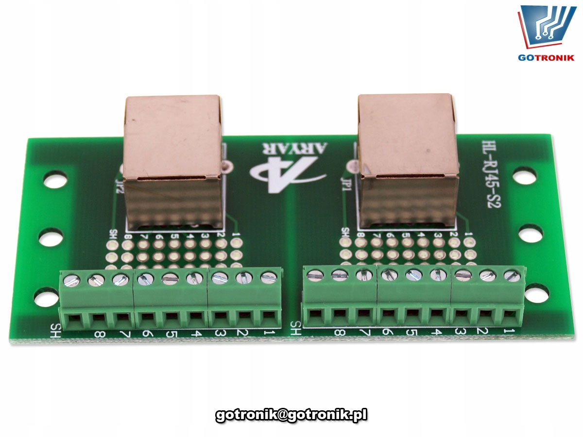 Универсальная печатная плата с двумя сетевыми розетками RJ45 для установки на рейку DN 35 мм с помощью специальных держателей. Подключенный сигнал со штекера RJ45 проходит через печатную плату, на которой у пользователя имеются 4 отверстия для пайки кабеля или разъема. Терминальная заделка представляет собой винтовое соединение, с помощью которого можно скрутить зачищенный провод или кабель без необходимости пайки. Плату можно использовать как разветвитель сигнала с разъема RJ45.
