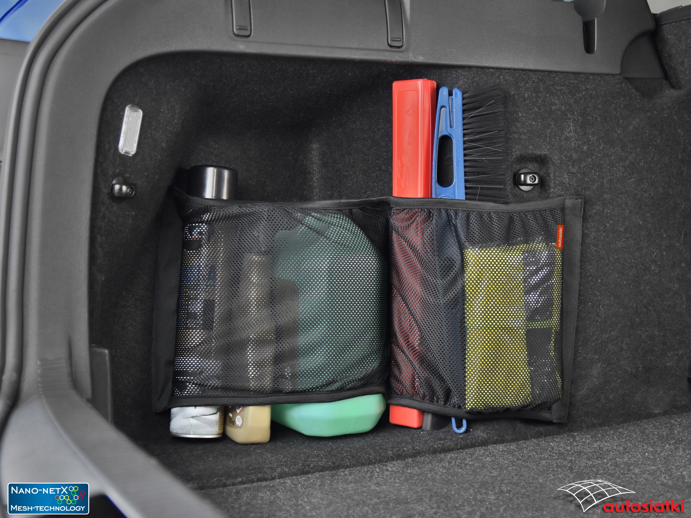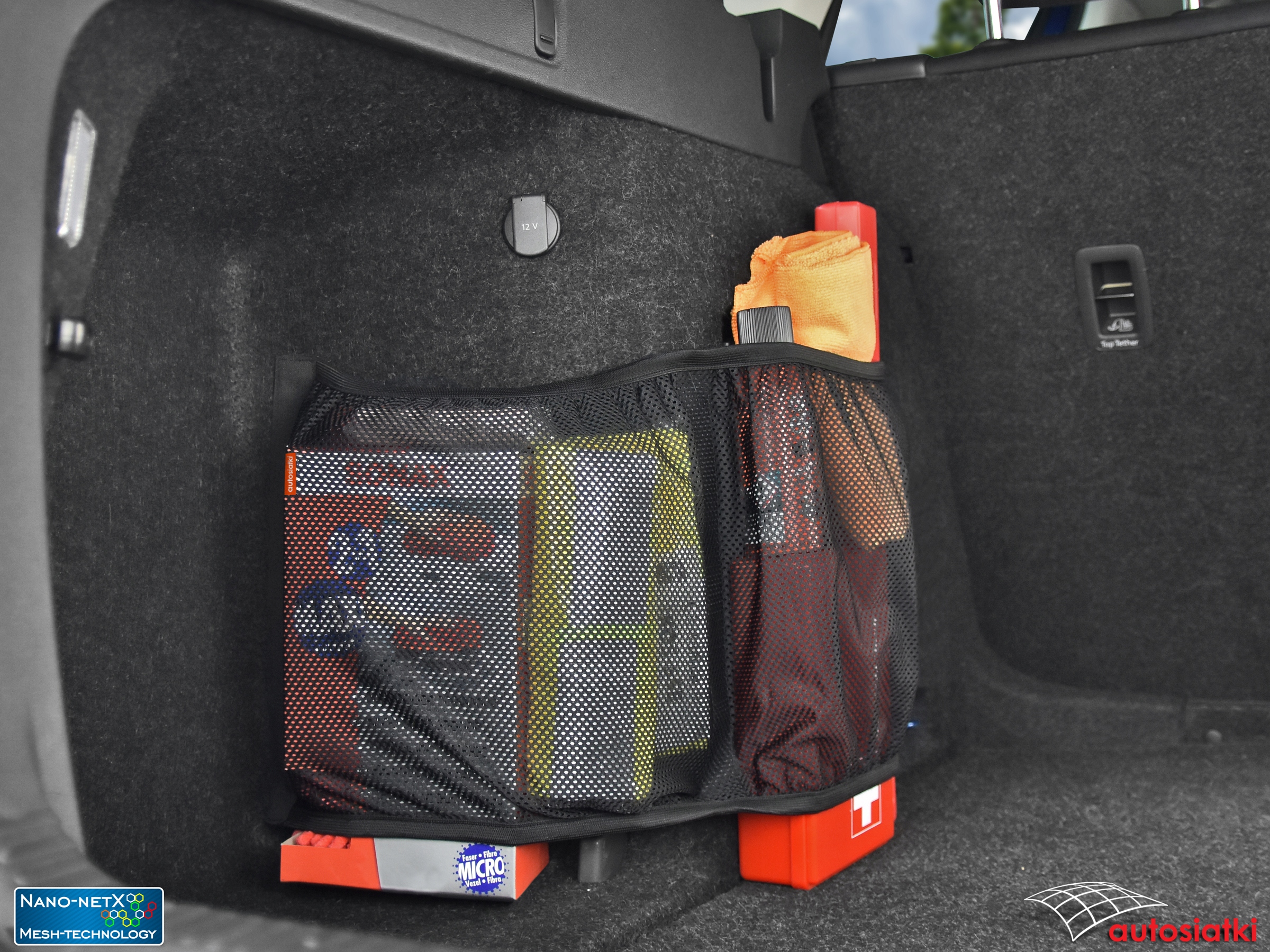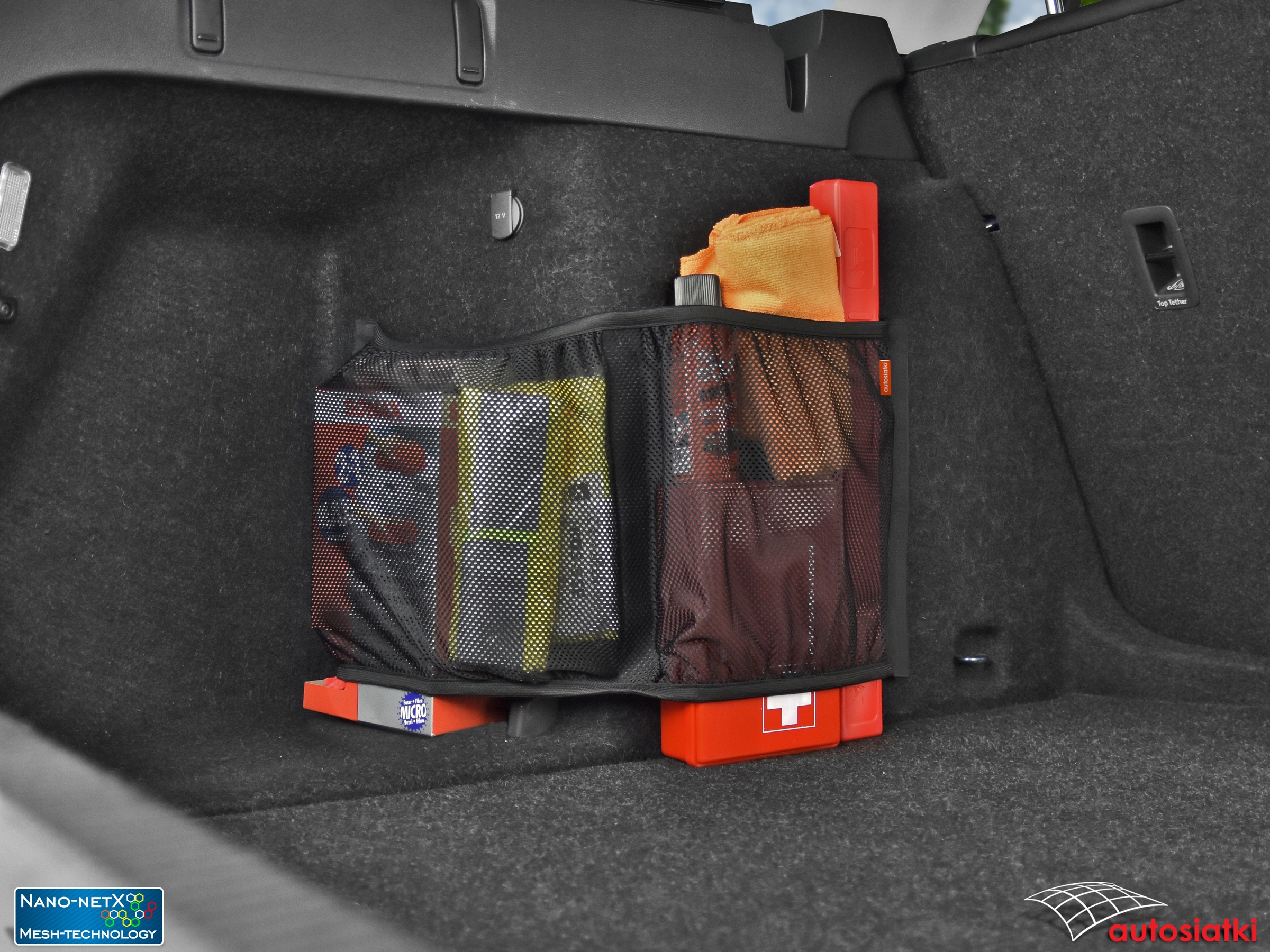 Это прочная сетка Nano-NetX, отделанная лентой-липучкой по бокам и посередине. Отделка гибкой резиной сверху и снизу, что позволяет подогнать сетку под транспортируемые предметы. Используемый материал Mesh-Technology защищает даже небольшие предметы от выпадения. Сетчатый разделитель позволяет разделить аксессуары. Ограждение крепится к ковру или обивке багажника автомобиля.