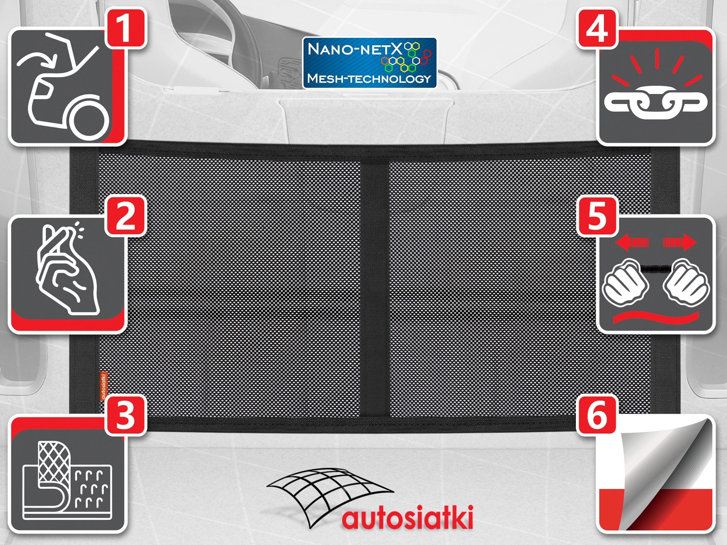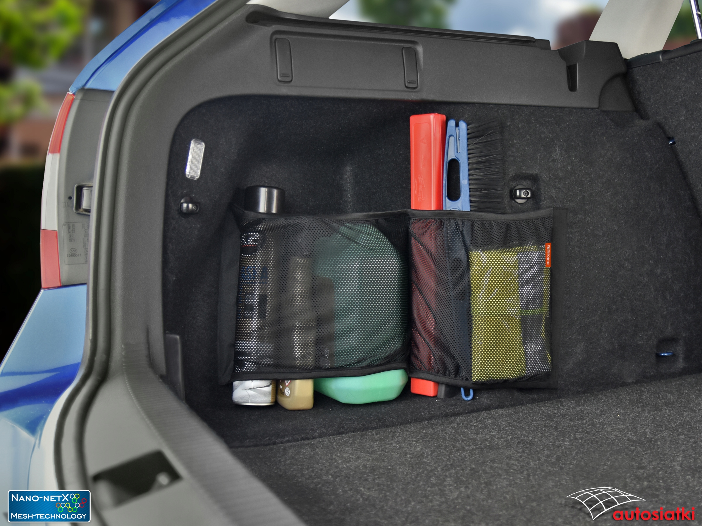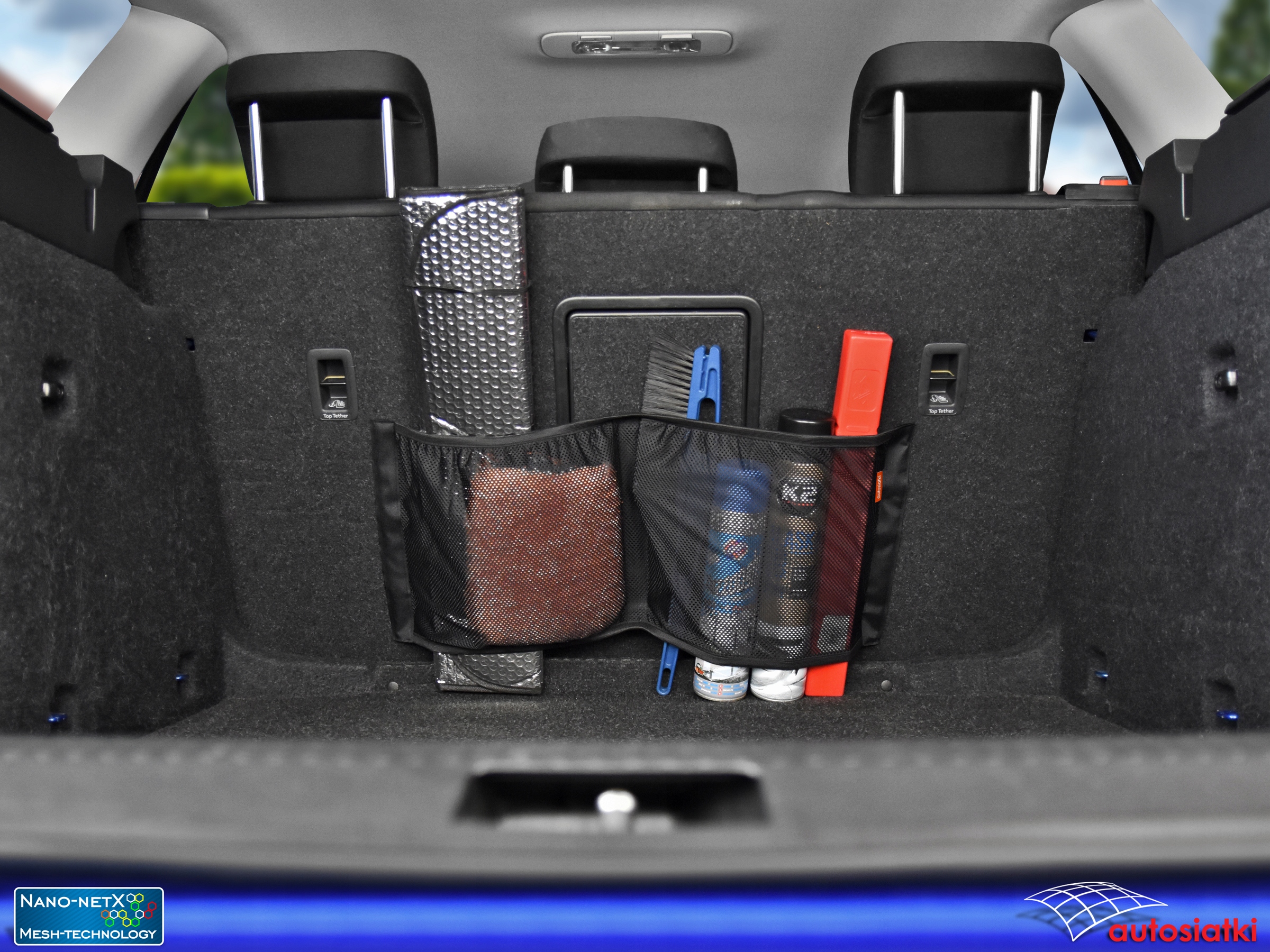 Это прочная сетка Nano-NetX, отделанная лентой-липучкой по бокам и посередине. Отделка гибкой резиной сверху и снизу, что позволяет подогнать сетку под транспортируемые предметы. Используемый материал Mesh-Technology защищает даже небольшие предметы от выпадения. Сетчатый разделитель позволяет разделить аксессуары. Ограждение крепится к ковру или обивке багажника автомобиля.