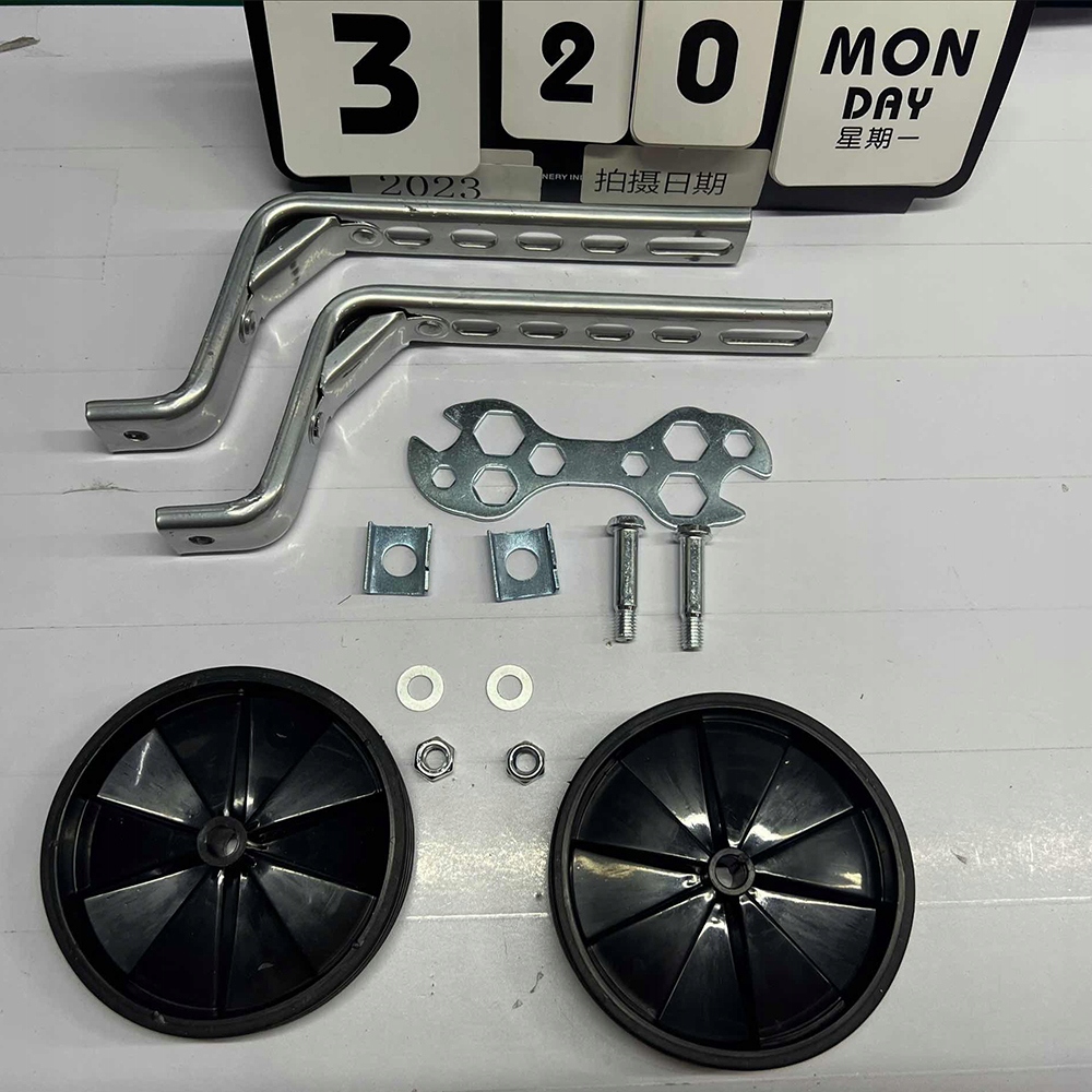 Изделие состоит из 1 пары черных колес, 2 опорных рамок, соответствующих винтов и 1 многофункционального ключа. Стабилизаторы велосипеда изготовлены из высококачественного металла, пластика, что обеспечивает дополнительную устойчивость и безопасность, обеспечивает безопасность детей, прочность и долговечность.