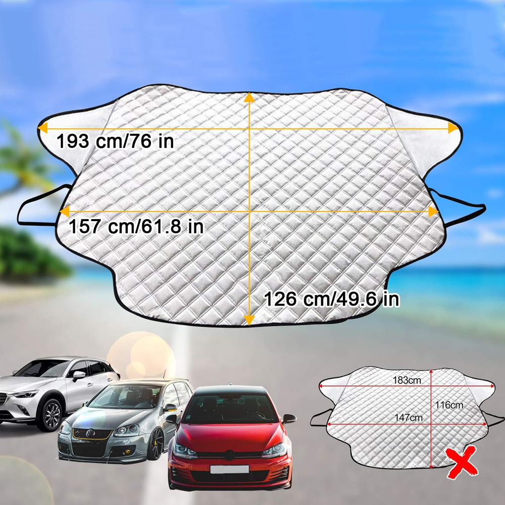 Увеличенного размера 193×157×126 см достаточно, чтобы покрыть все лобовое стекло и дворники, на 99% подходит для легковых автомобилей, фургонов, грузовиков, внедорожников и других типов транспортных средств.