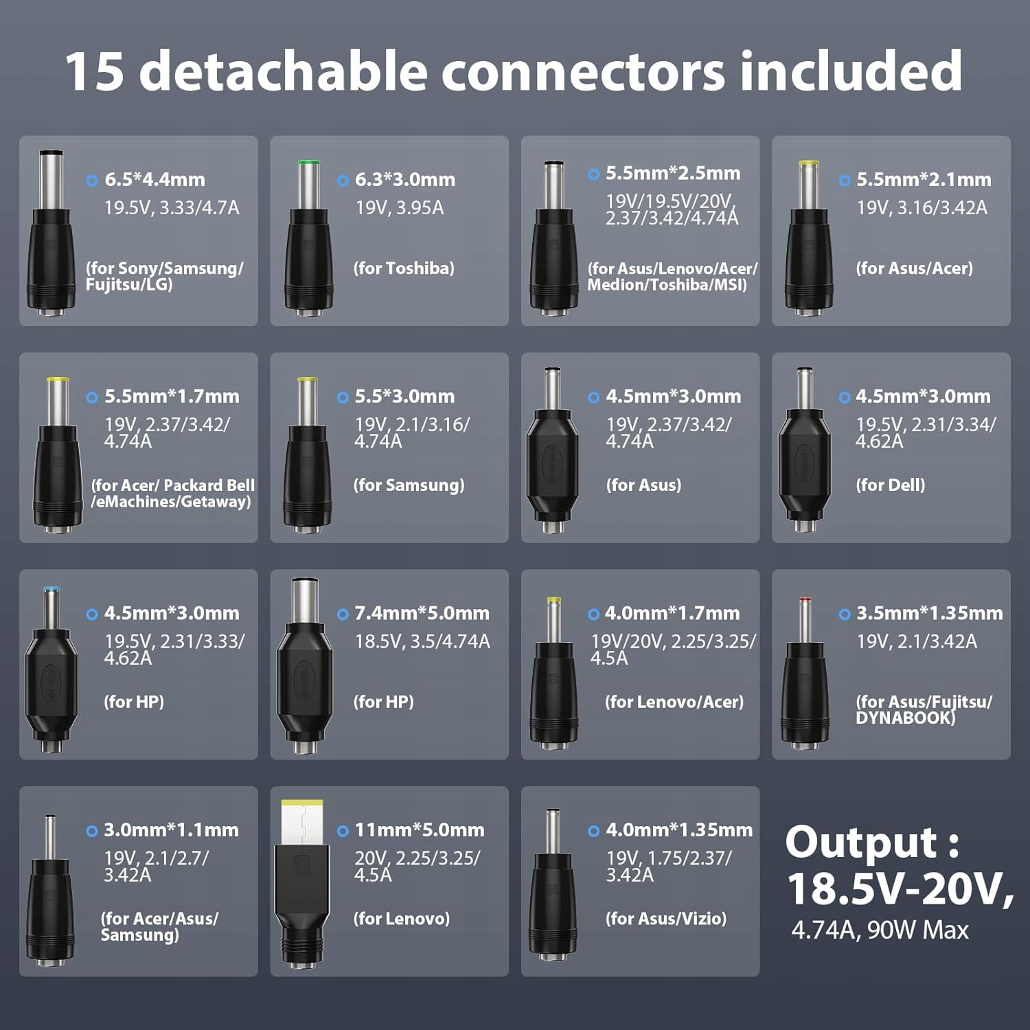 Этот универсальный блок питания подходит для всех оригинальных размеров адаптеров, которые мы предлагаем. Также совместим с мощностью 45 Вт, 65 Вт, 90 Вт, макс. 90 Вт. Мы перечисляем только некоторые совместимые модели ноутбуков. (Проверьте свой оригинальный адаптер).