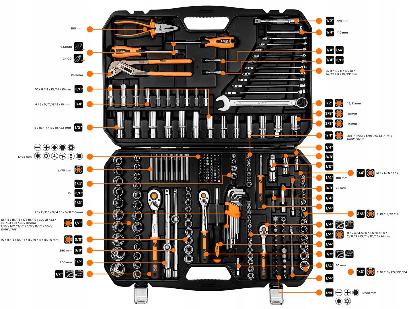 Натуральные ключи Neo 233 El. Это самый большой набор, доступный в предложении! Сталь. Ключи (все самые популярные размеры от 8 до 22 мм), адаптеры для отверток (благодаря которого можно настроить элементы для конкретных электронов), 4 заглушки для свечей (возможность быстрой конструкции из доступных элементов, ключ связывания К свечам, которые идеально соответствуют определенному типу двигателя), аксессуары