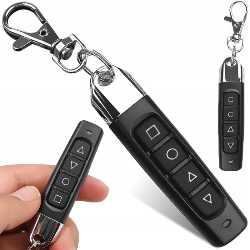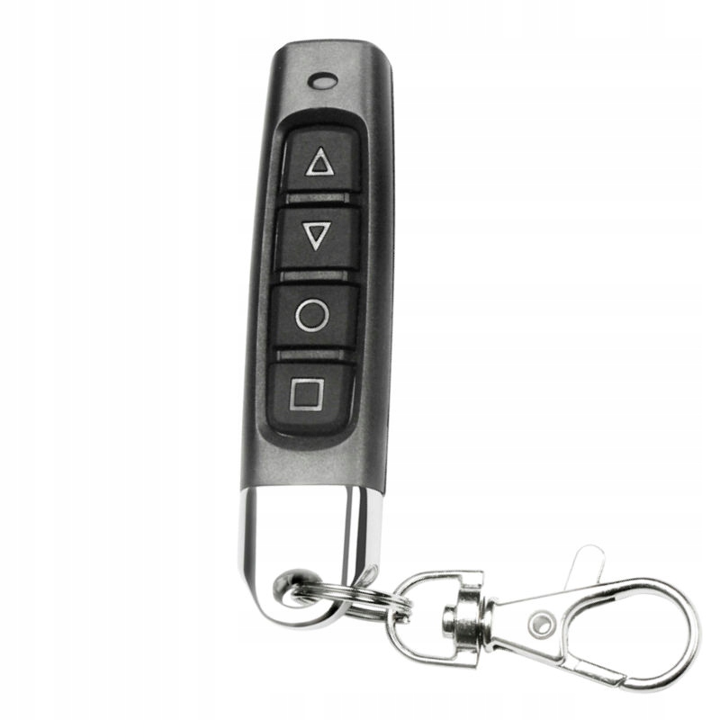 Пульт дистанционного управления имеет четыре кнопки управления (квадрат, круг и стрелки вверх и вниз), благодаря которым вы можете открывать/закрывать ворота и многое другое! Кнопки служат для калибровки пульта со старым пультом и передачи кода. Пульт дистанционного управления имеет небольшие размеры (68×16,3×14,9 мм) и поместится практически в любой карман или сумочку. Он оснащен карабином, с помощью которого его можно прикрепить, например, к ключам или петле для ремня на брюках.