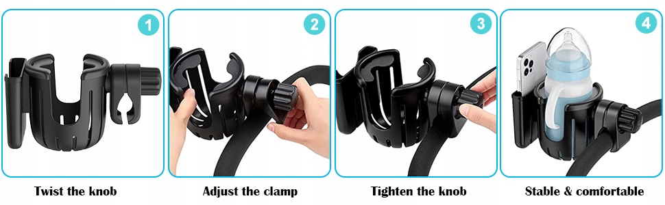 🍼📲【ЛЕГКО МОНТАЖ】 - Зажим с резиновой прокладкой помогает зафиксировать подстаканник на перекладине, не перемещая его. Зажим также может вращаться на 360 градусов и регулироваться для стержней разных размеров диаметром 0,55–1,7 дюйма / 1,4–4,5 см.