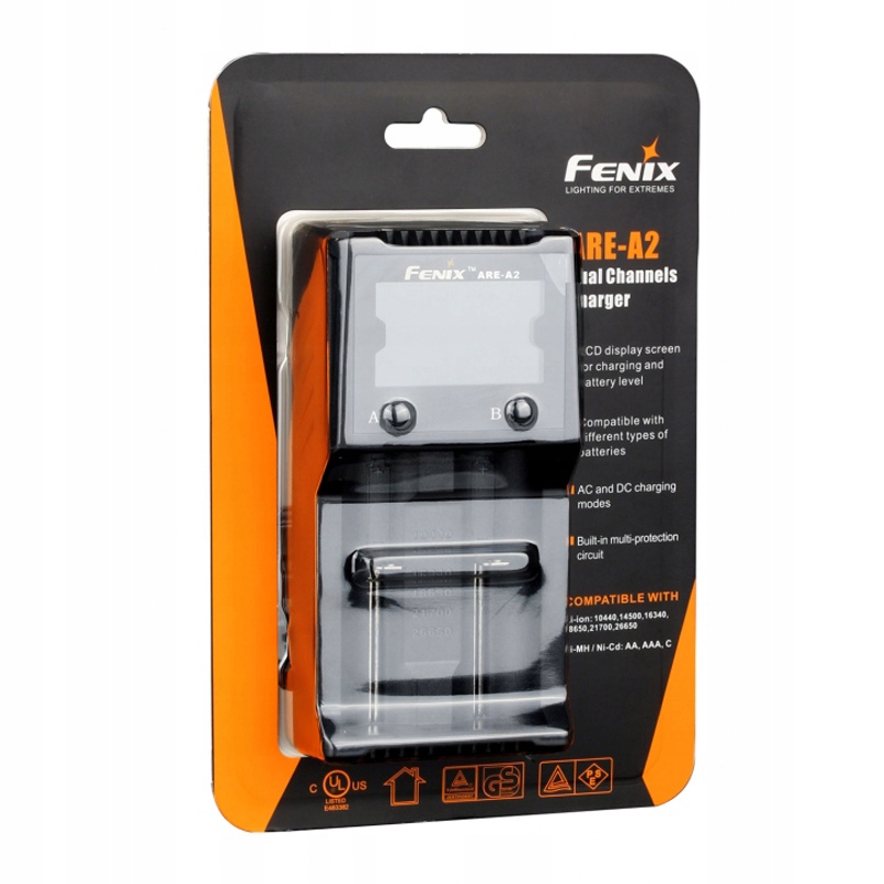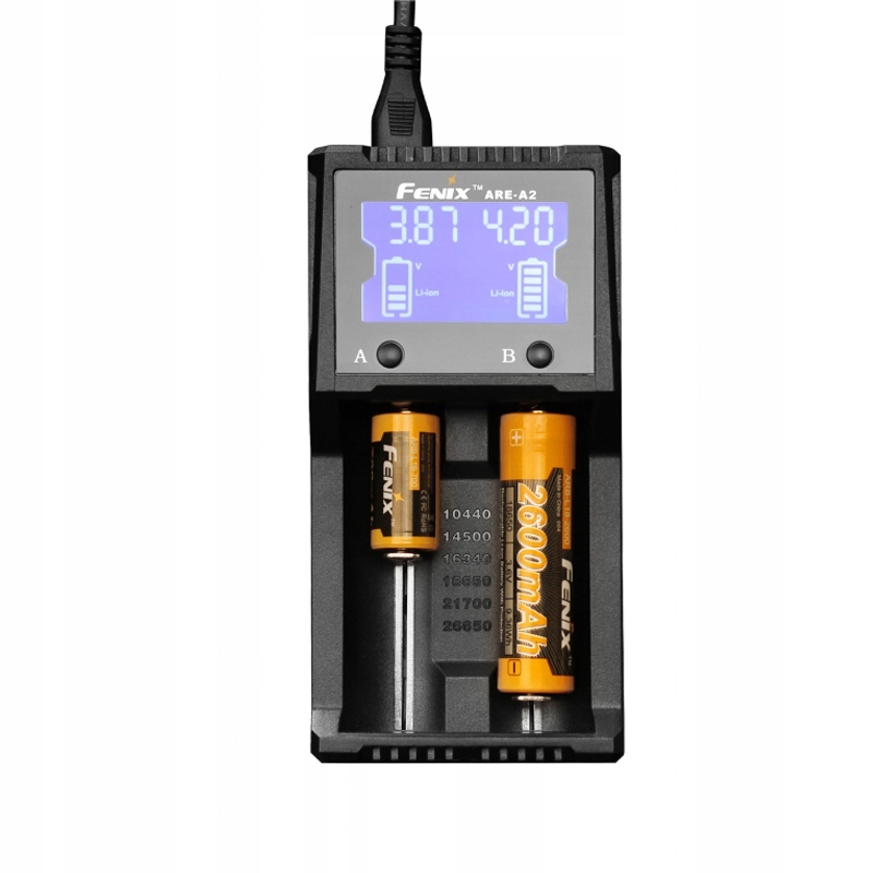 Fenix ARE-A2 — интеллектуальное зарядное устройство нового поколения, позволяющее правильно и безопасно заряжать различные типы литий-ионных, никель-металлгидридных и никель-кадмиевых аккумуляторов. Несмотря на продвинутую конструкцию, эксплуатация устройства предельно проста. После установки аккумуляторов и подключения зарядного устройства к сети на ЖК-дисплее появится информация об уровне напряжения и графическая визуализация уровня их заряда. Различные типы элементов можно заряжать одновременно, микропроцессор автоматически регулирует зарядный ток.