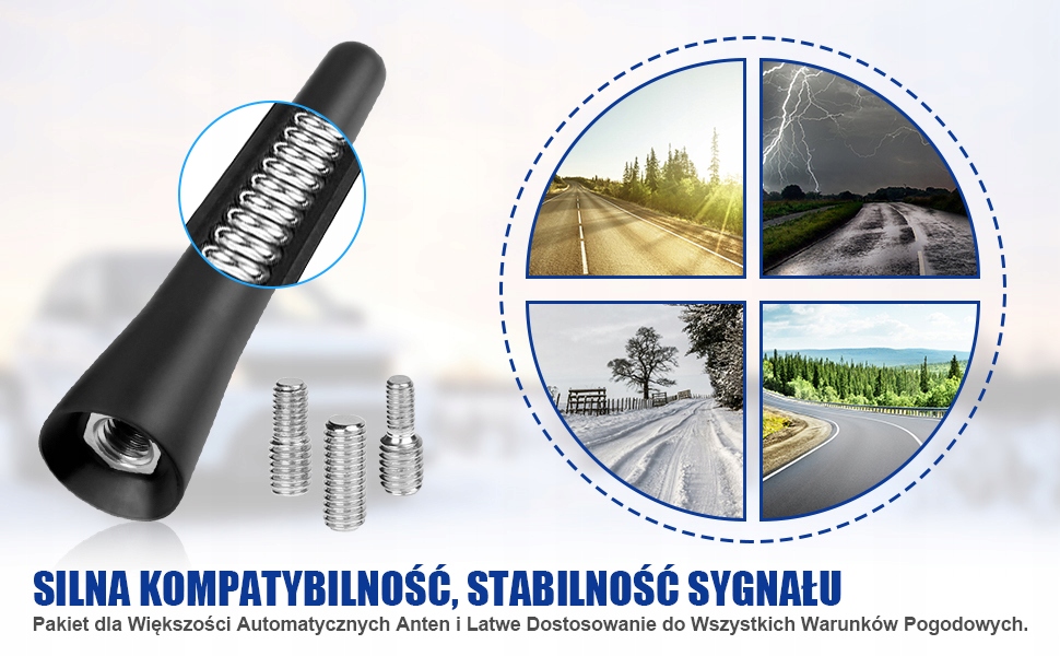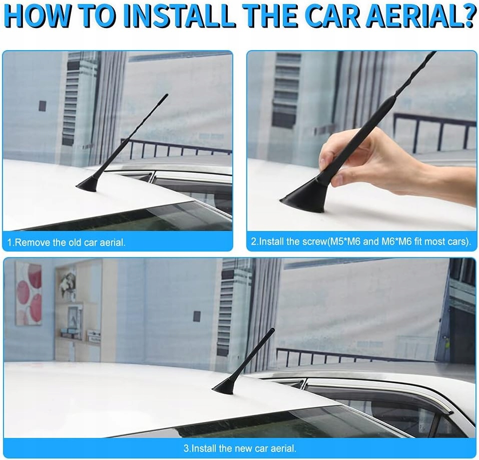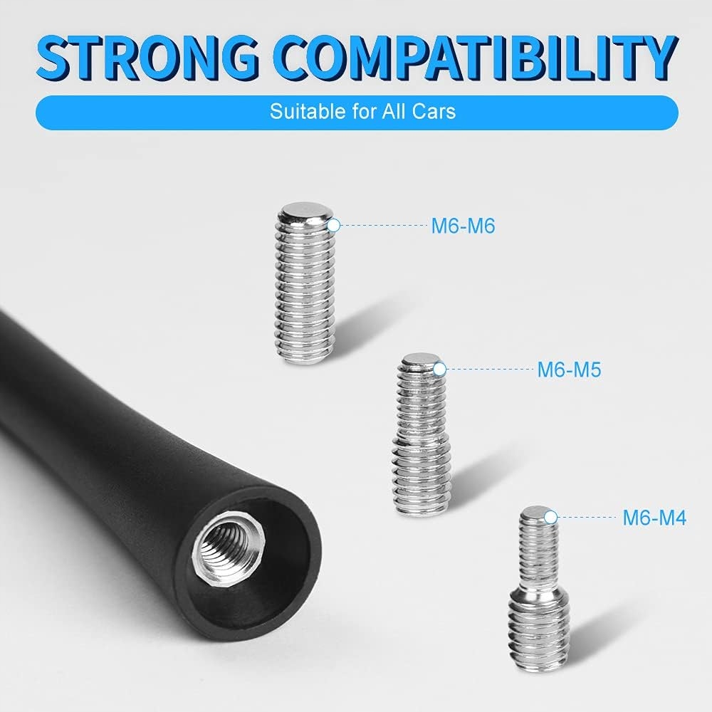 На выбор предлагаются две антенны длиной 18,5 см и 6,5 см, оснащенные винтами M4, M5, M6, подходящие для большинства автомобилей с винтовыми основаниями антенн.