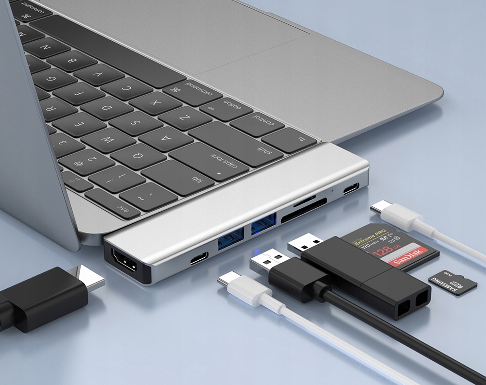 Позволяет расширить Macbook с разъемом USB-C дополнительным устройством чтения карт USB/HDMI/USBC/SD+TF