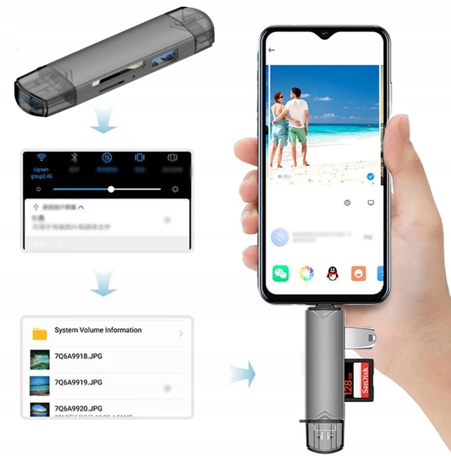 USB3.0 Reader с портом USB, портом микро-USB и портом типа C, благодаря которому карта снявчик совместим с планшетами и смартфонами, которые поддерживают функцию OTG.