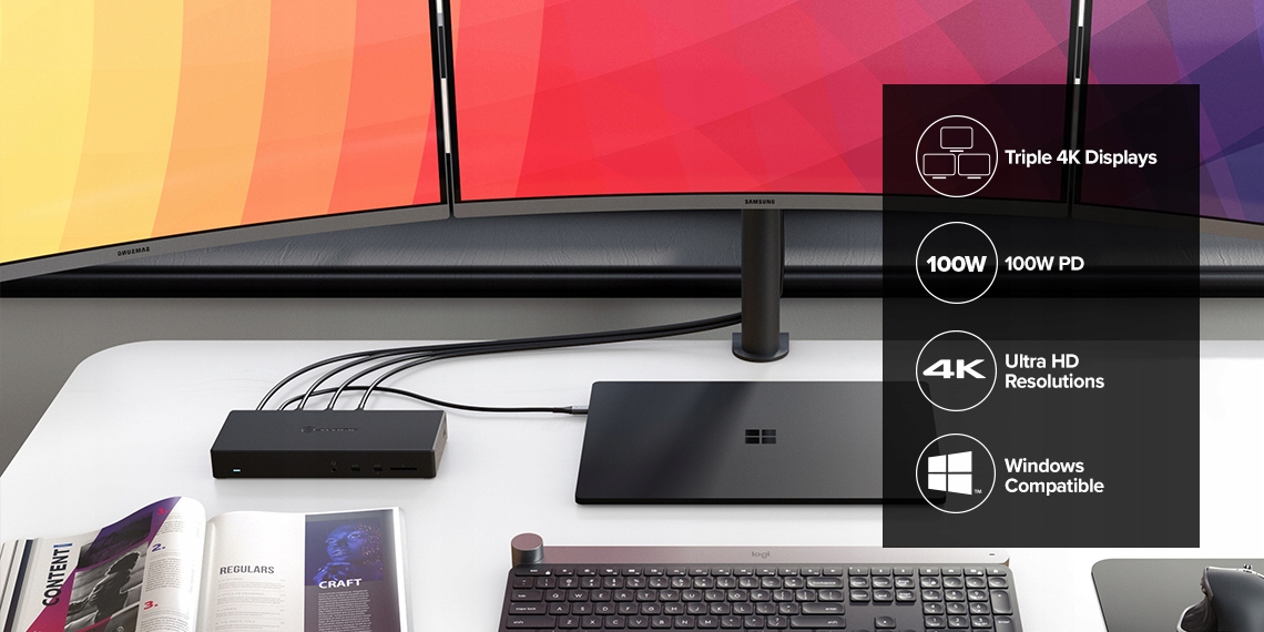 Док -станция загружает ноутбук с мощностью до 100 Вт во время использования. Это позволяет использовать идеальное решение с одним кабелем для одновременного добавления множества дисплеев, USB -аксессуаров, сети Gigabit Ethernet, наушников/микрофона и зарядки ноутбука. p>