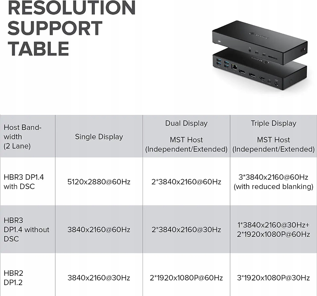 Док -станция Ma3 может поддерживать до трех внешних дисплеев через 2 x Displayport (DP ++ / DP 1.4) и 1 X HDMI 2.0. Док -станция поддерживает расширение или дублирование на трех внешних дисплеях, когда она используется с ноутбуком с окнами.