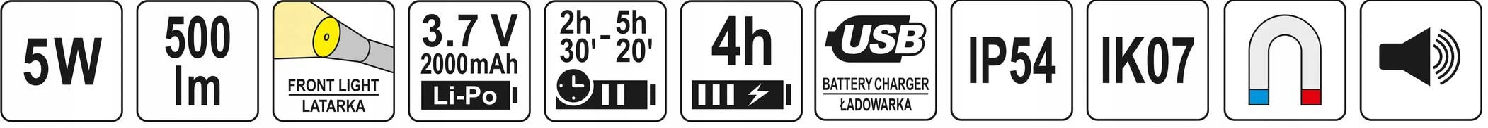 Прочный алюминиевый фонарик YATO, оснащенный диодом COB, который обеспечивает свет мощностью 500 лм и дальностью действия 28 м. Три режима работы позволяют регулировать освещение в зависимости от выполняемых действий и уровня заряда аккумулятора. Оснащенный литий-ионным аккумулятором 3,7В 2000мАч, он обеспечит до 5 часов 20 минут работы и позволит заряжать другие устройства - функция powerbank. Устройство можно подключить, например, к телефону через Bluetooth и воспроизводить любимую музыку благодаря высококачественному динамику.