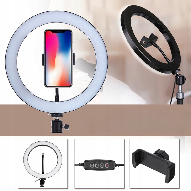 Кольцевая лампа с диаметром 26 см с возможностью изменить цвет света и складной штативы на высоту 220 см. Идеальный набор освещения для каждого любителя. Салон