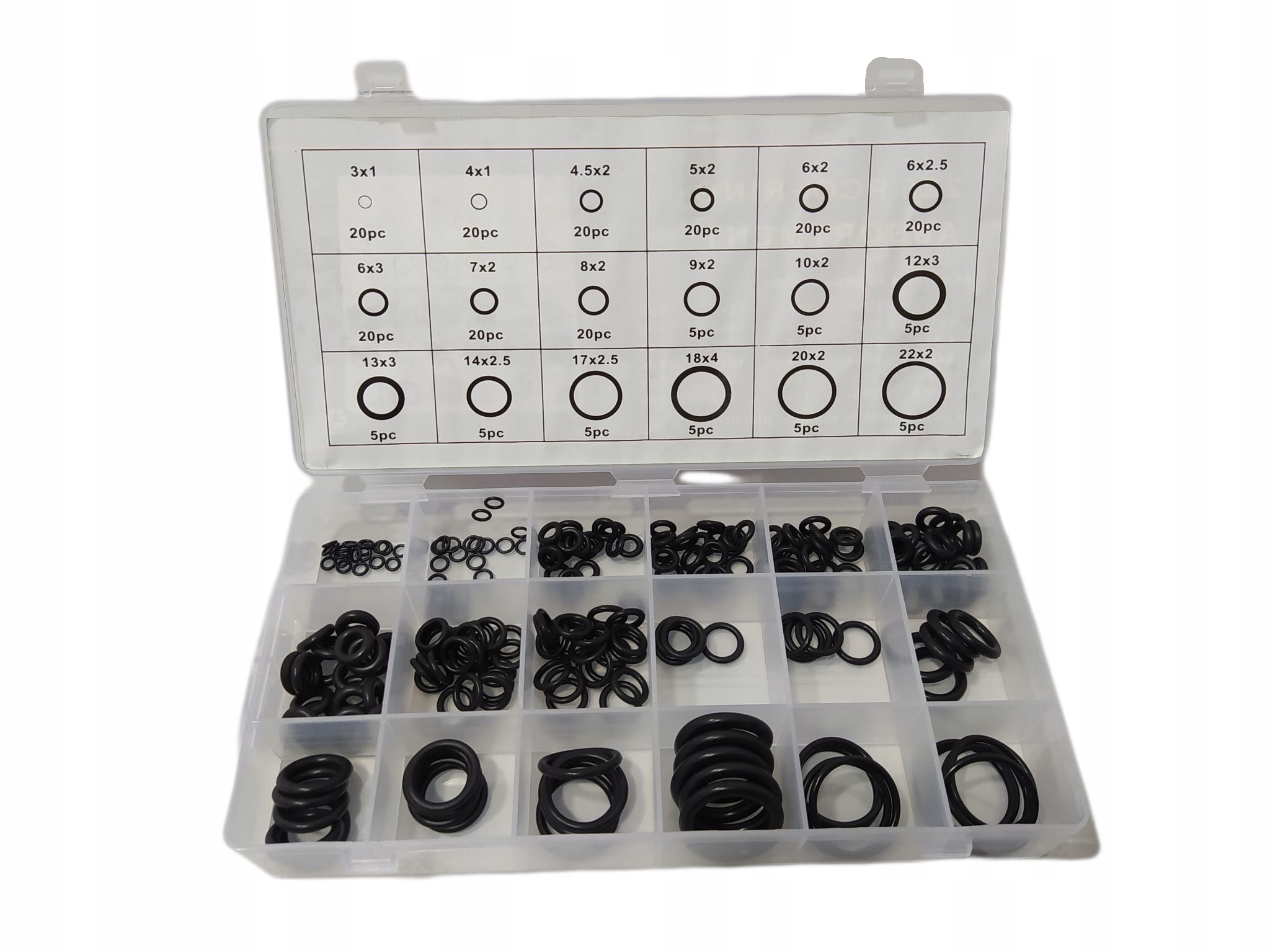 В наборе 225 штук печатей размером от 3мм до 22мм. Уплотнения изготовлены из прочной резины, устойчивой к химическим веществам. Уплотнительные кольца обеспечивают герметичность в любых условиях.