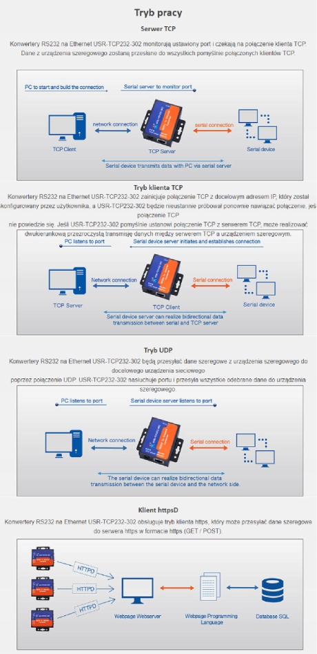 Преобразователи RS232 в Ethernet USR-TCP232-302 инициирует TCP-соединение с целевым IP-адресом, настроенным пользователем, а USR-TCP232-302 будет постоянно пытаться восстановить соединение в случае сбоя TCP-соединения. Если USR-TCP232-302 успешно устанавливает TCP-соединение с TCP-сервером, он может реализовать двустороннюю прозрачную передачу данных между TCP-сервером и последовательным устройством.
