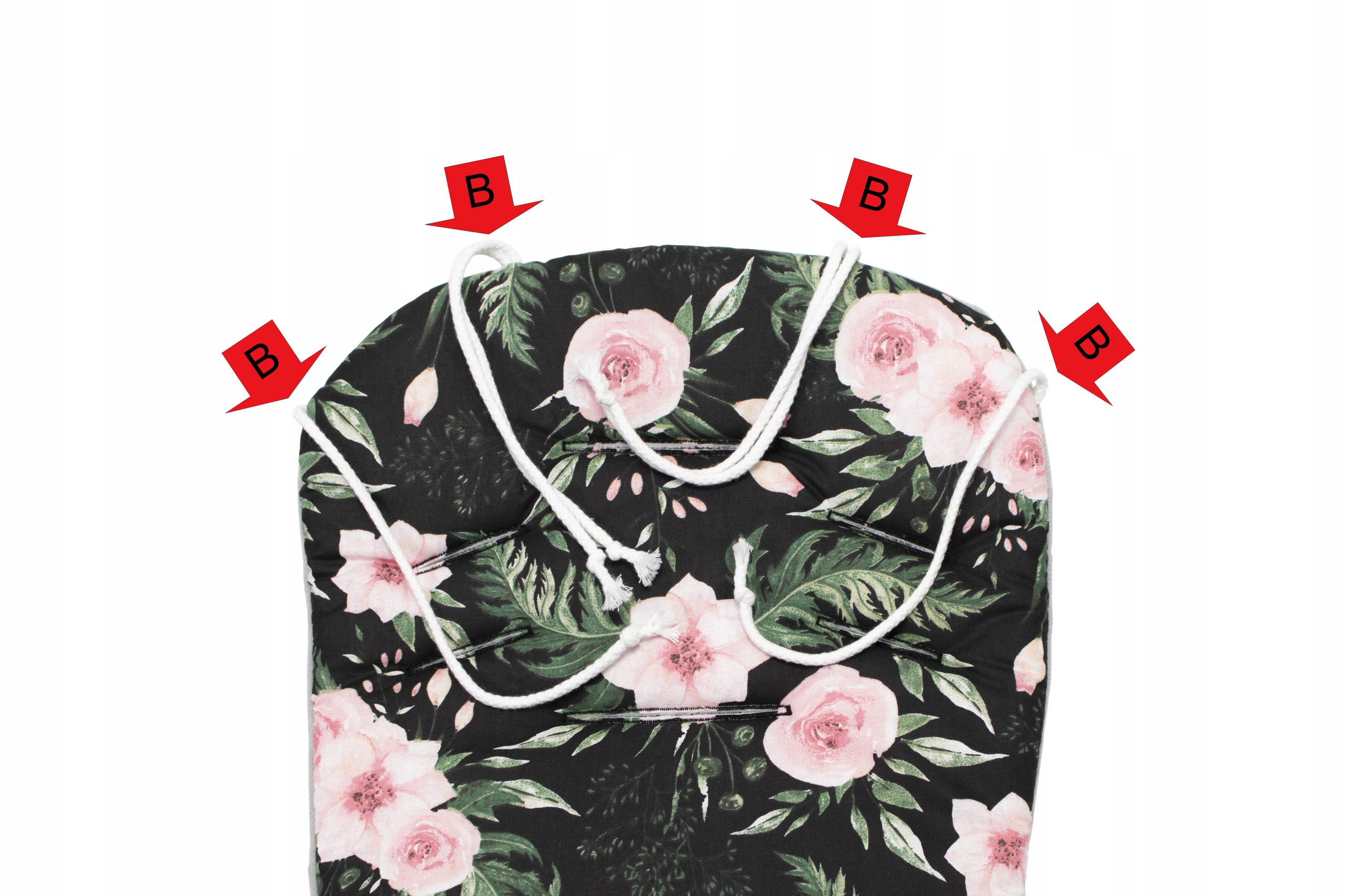 B-Вшитые завязки позволяют прикрепить вставку к спинке коляски, это предотвращает соскальзывание вставки с сиденья