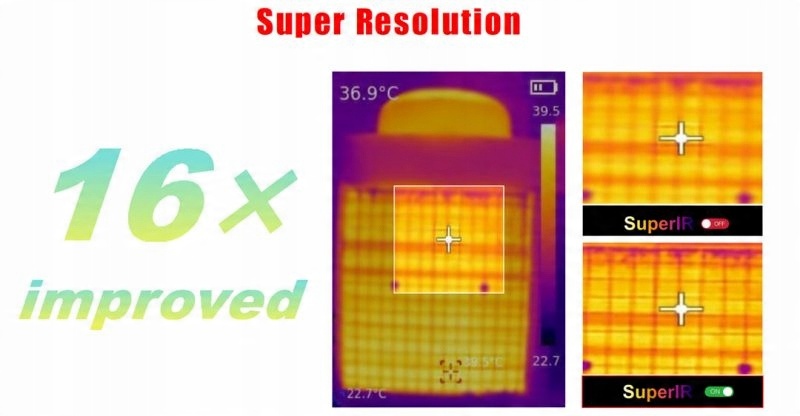- Супер разрешение: 320x240 пикселей (функция Superresolution улучшает качество теплоизображения с помощью расширенной обработки данных. Короче говоря, эта функция анализирует и объединяет информацию из многих кадров, создавая изображение более высокого разрешения, аналогичное 320x240 пикселям. )