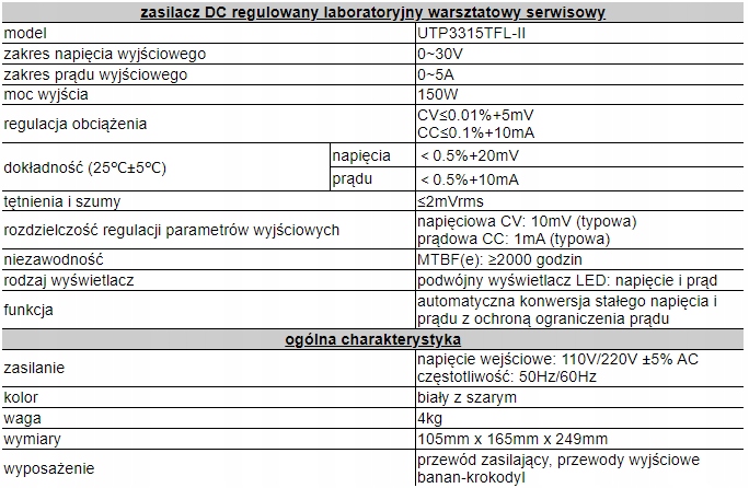 UTP3315TFL-II. Производство единиц. Мы можем плавно регулировать выходное напряжение с помощью потенциометров. Эффективность тока, то есть максимальный выходной ток, составляет 5A во всем диапазоне напряжения выхода. Максимальная выходная мощность составляет 150 Вт. Таким образом, практически независимо от того, есть ли у нас выходное напряжение 3,3 В или 5,0 В или даже максимум 30 В является источником питания до 5А для питания приемника. Лабораторный источник питания является универсальным при поставке электронных устройств и модулей. Power Power Power Power-Piets Power-II UTP3315TFL-II, успешно используемый любителями, любительской электроникой, а также для работы в лабораториях, услуги семинара. Питание UTP3315TFL-II оснащен двумя семисегментированными светодиодами красным цветом для напряжения (вольтметр) и зеленым для выходной площадки (Ammeter).