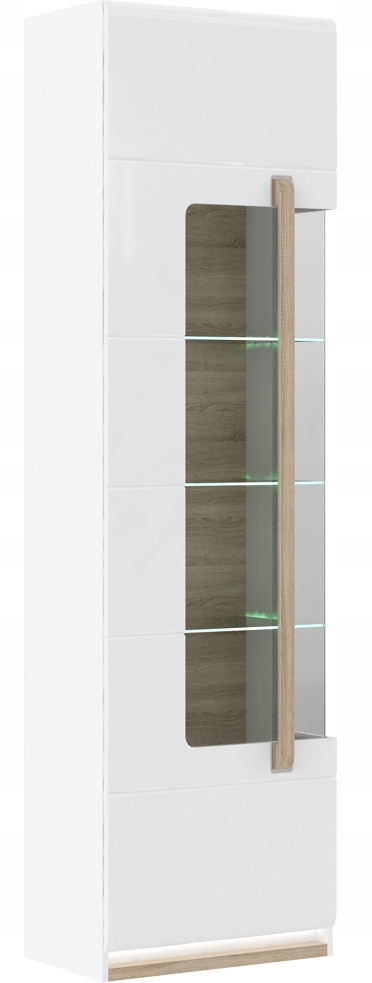 Сплошные белые формы из ВНИМАНИЕ! коллекция – это ломаные вставки из дуба Сонома. Фасады изготовлены из плиты МДФ, покрытой глянцевой белой пленкой ПВХ, а их поверхность разделена тонкой параллельной фрезеровкой. Ящики оснащены современными направляющими с бесшумной системой закрывания. Внутренняя часть витрин с декором «Дуб Сонома» прекрасно контрастирует с блестящими белыми фасадами, а дверцы выполнены из закаленного стекла. Характерной особенностью коллекции являются декоративные планки в виде ручек и закругленные верхние края. Все это дополняется освещением, установленным внутри витрин, освещающим стеклянные полки и дополнительную подсветку цоколей, придающую каждому блоку ощущение легкости. Мебель поставляется в разобранном виде, в упаковках, для самостоятельной сборки.
