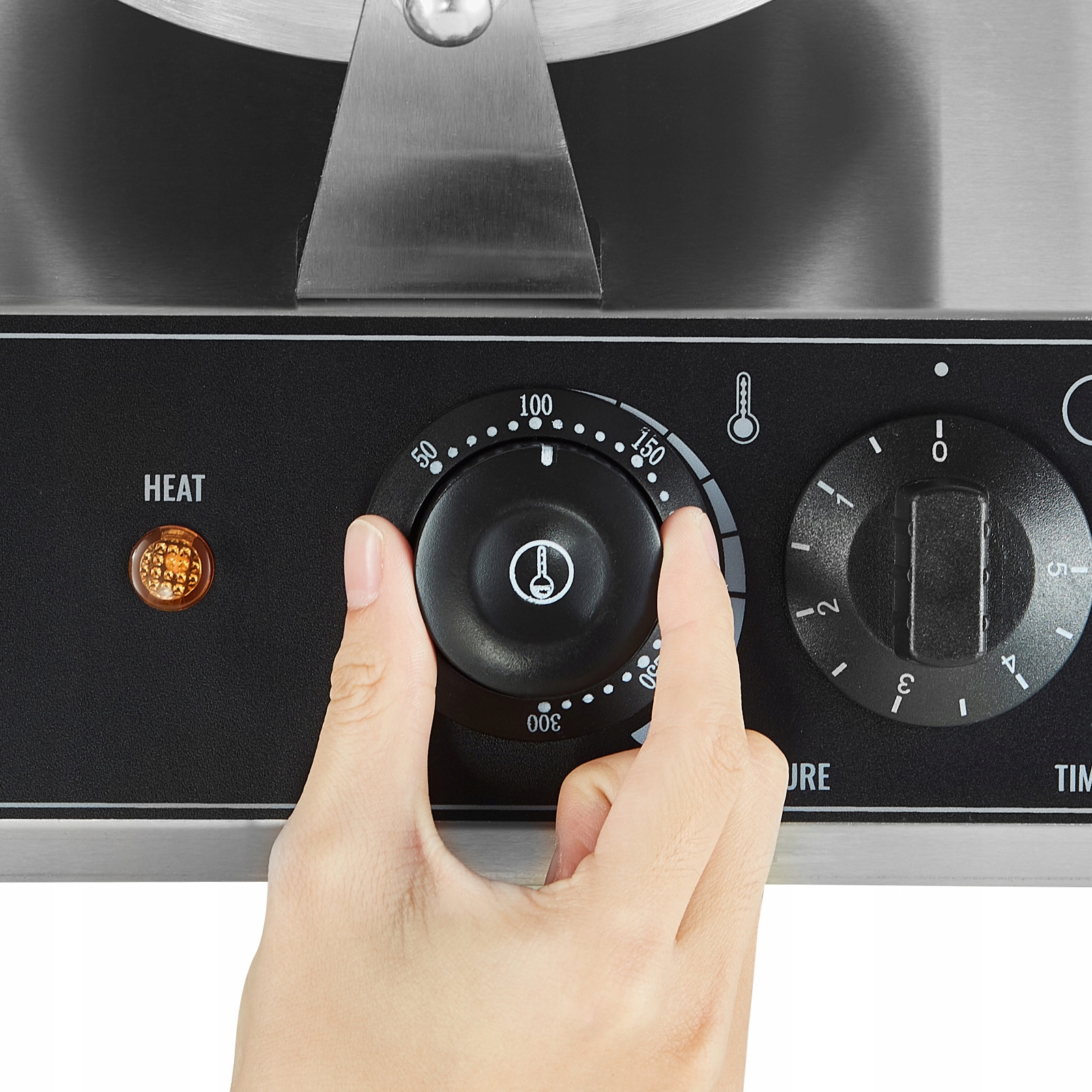 Регулируемая двойная температура: двойное вафельное железо имеет независимые панели управления, которые позволяют одновременно испечь две вафли. Диапазон регулировки температуры составляет 50-300 ° C (122-572 ° F). Благодаря этому вы можете создать свои собственные, уникальные вафли, хрустящие или мягкие. Устройство легко использовать благодаря регулируемому времени выпечки и звука, которые напоминают вам о добавлении теста и сообщили о готовности вафлей.
