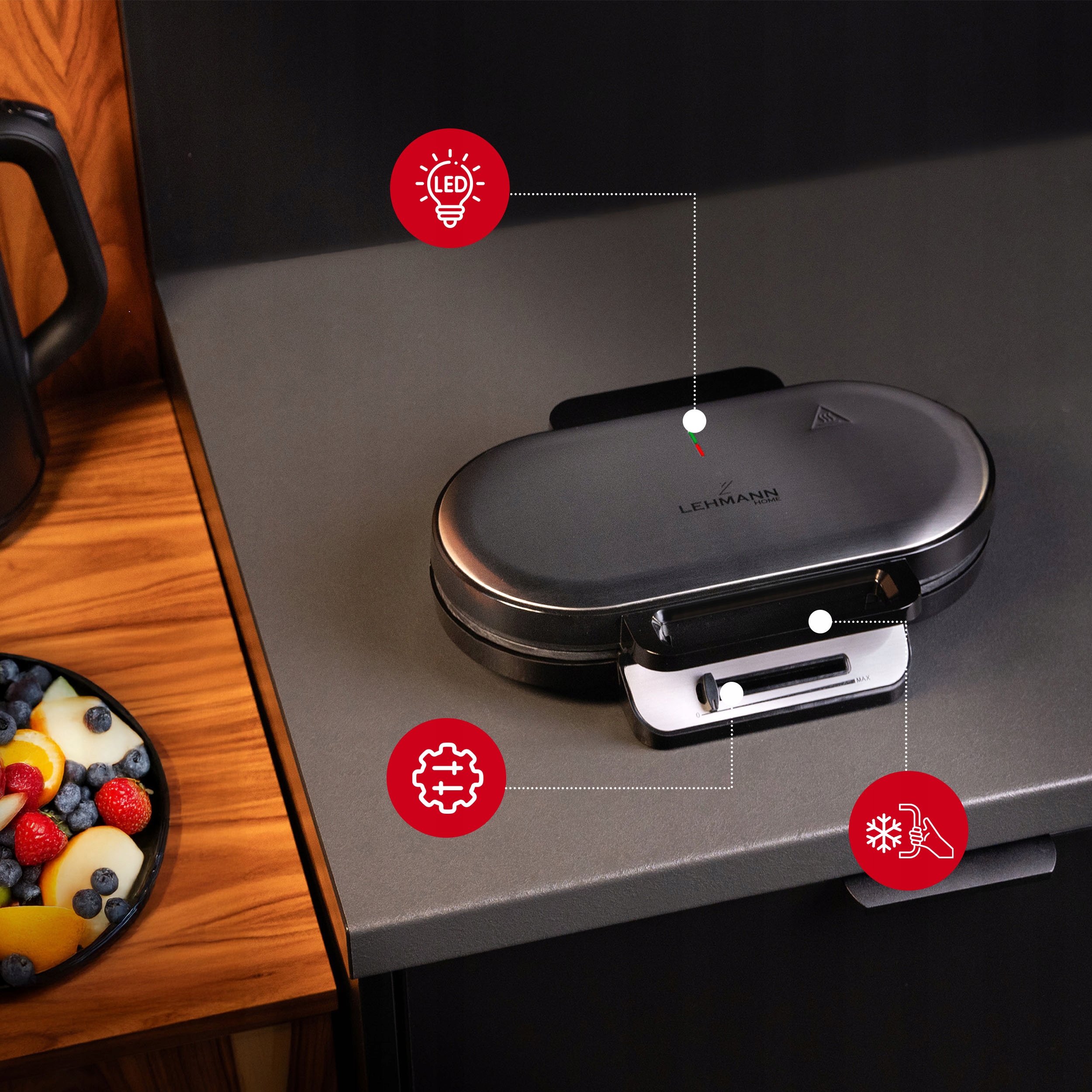 Вафельница Lehmann оснащена практичным ползунком для регулировки мощности. Благодаря этому вы можете легко регулировать степень пропекания – от слегка мягких до очень хрустящих вафель, всегда идеальных именно так, как вам нравится.